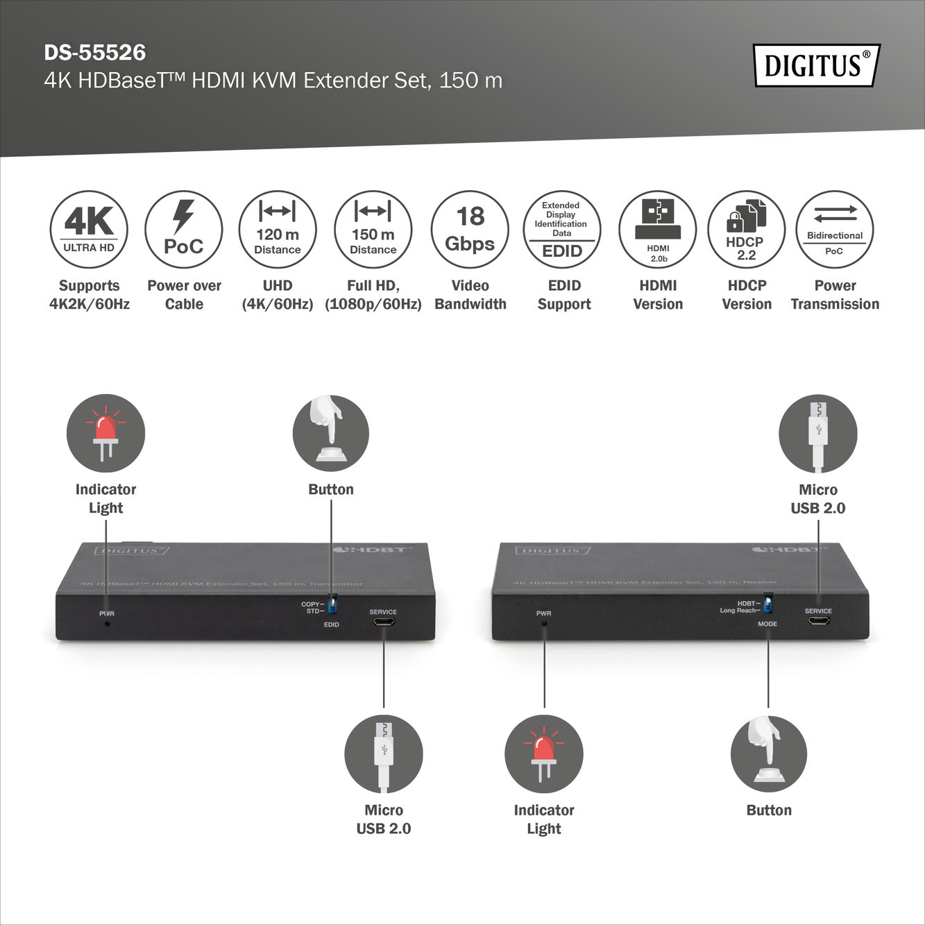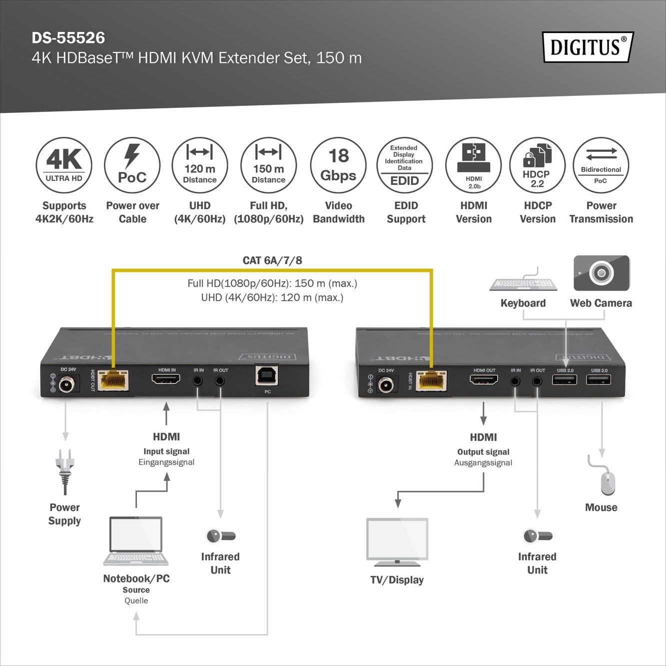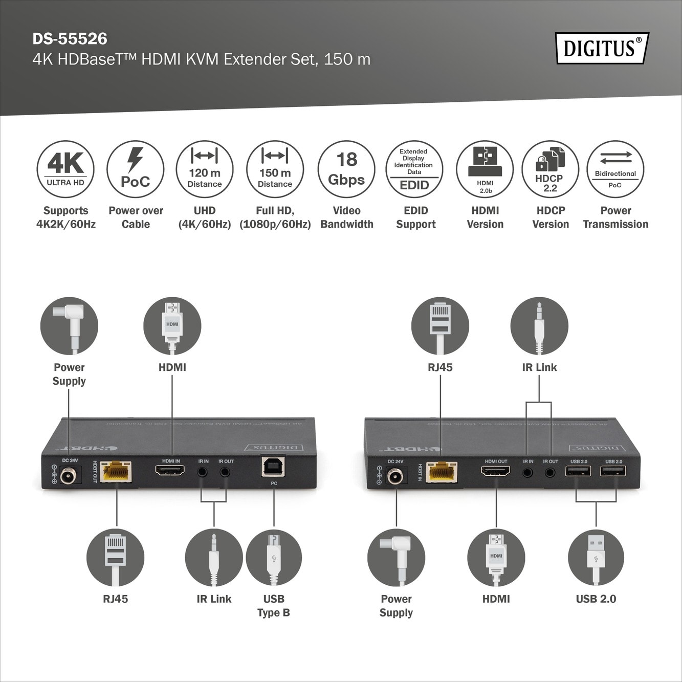 Assmann Electronic - Kit d'extension KVM HDBaseT, 150 m 4K / 60 Hz, USB 2.0, PoC, IR, noir - DS-55526