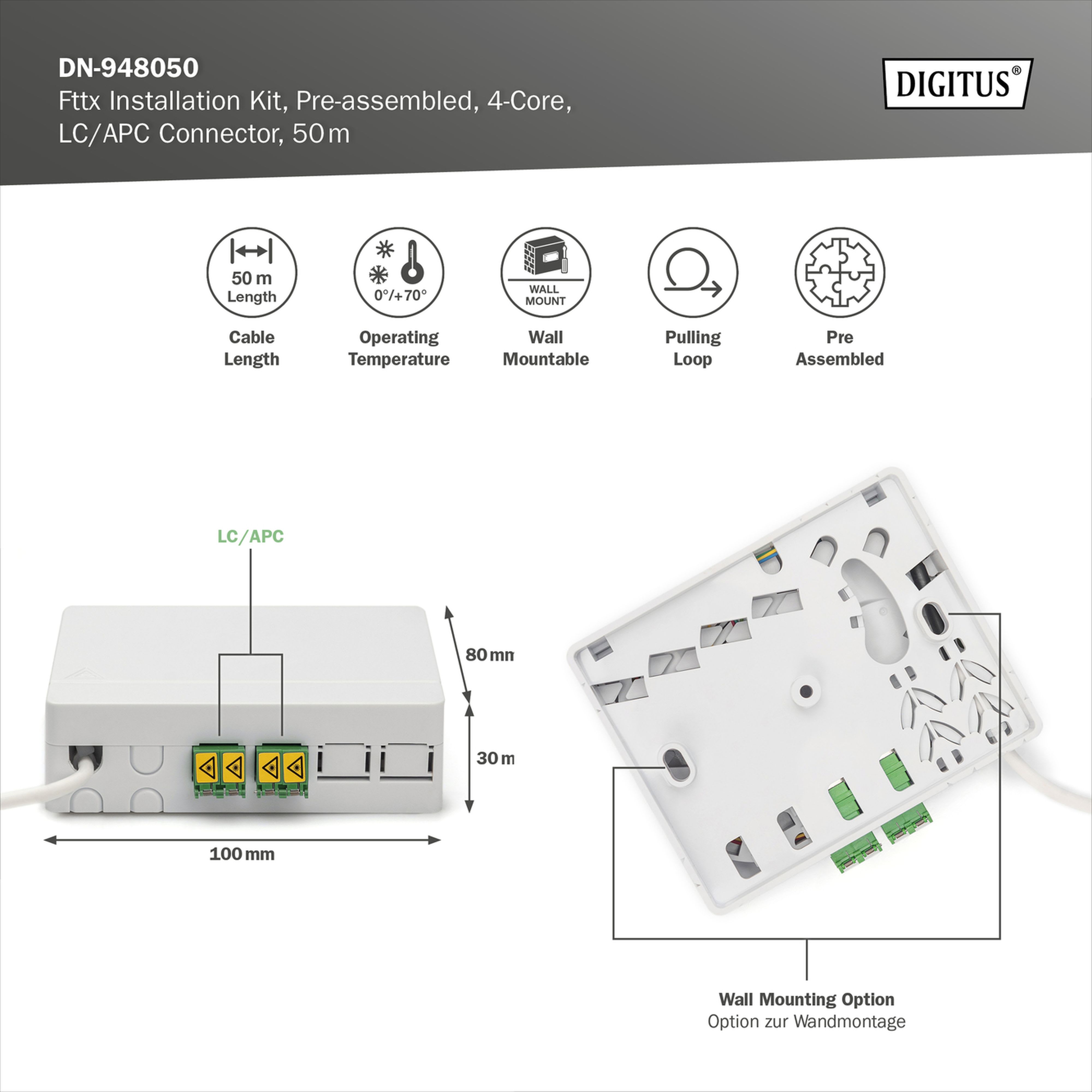 Assmann Electronic - Kit d?installation FTTx pré-câblé, 4 fibres, connecteur LC/APC, NE4, 50m - DN-948050