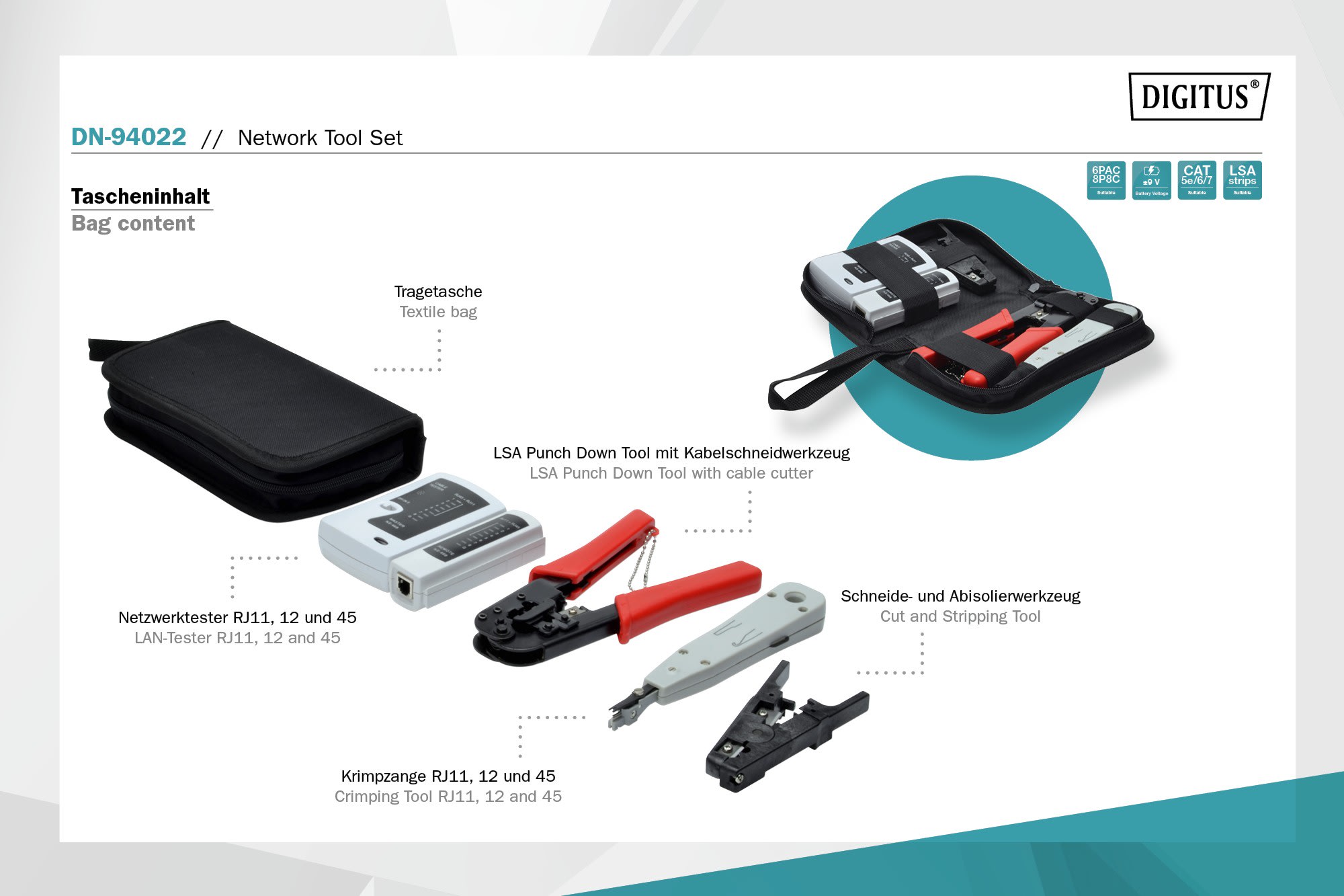 Assmann Electronic - Kit outils : testeur LAN, outil de sertissage, outil de découpe et LSA, sac - DN-94022