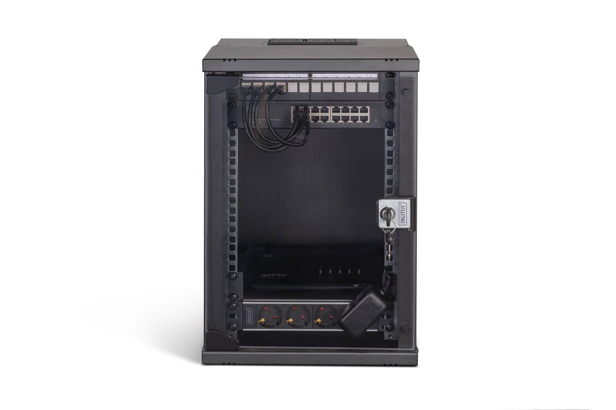 Kit complet pour la mise en place d'un réseau compact de 254 mm (10"), comprenant une armoire, une tablette, un bloc multiprises, un switch, un panneau de brassage, des modules Keystone, des câbles de brassage.