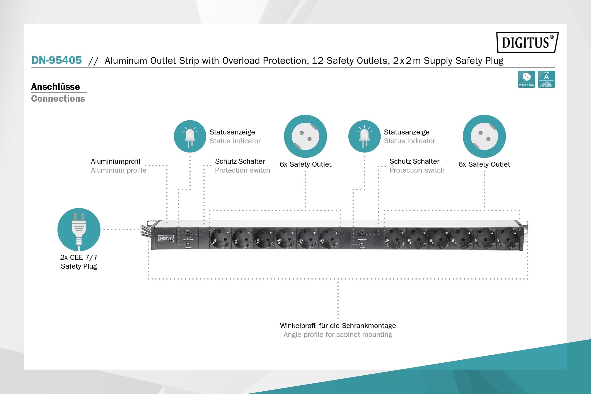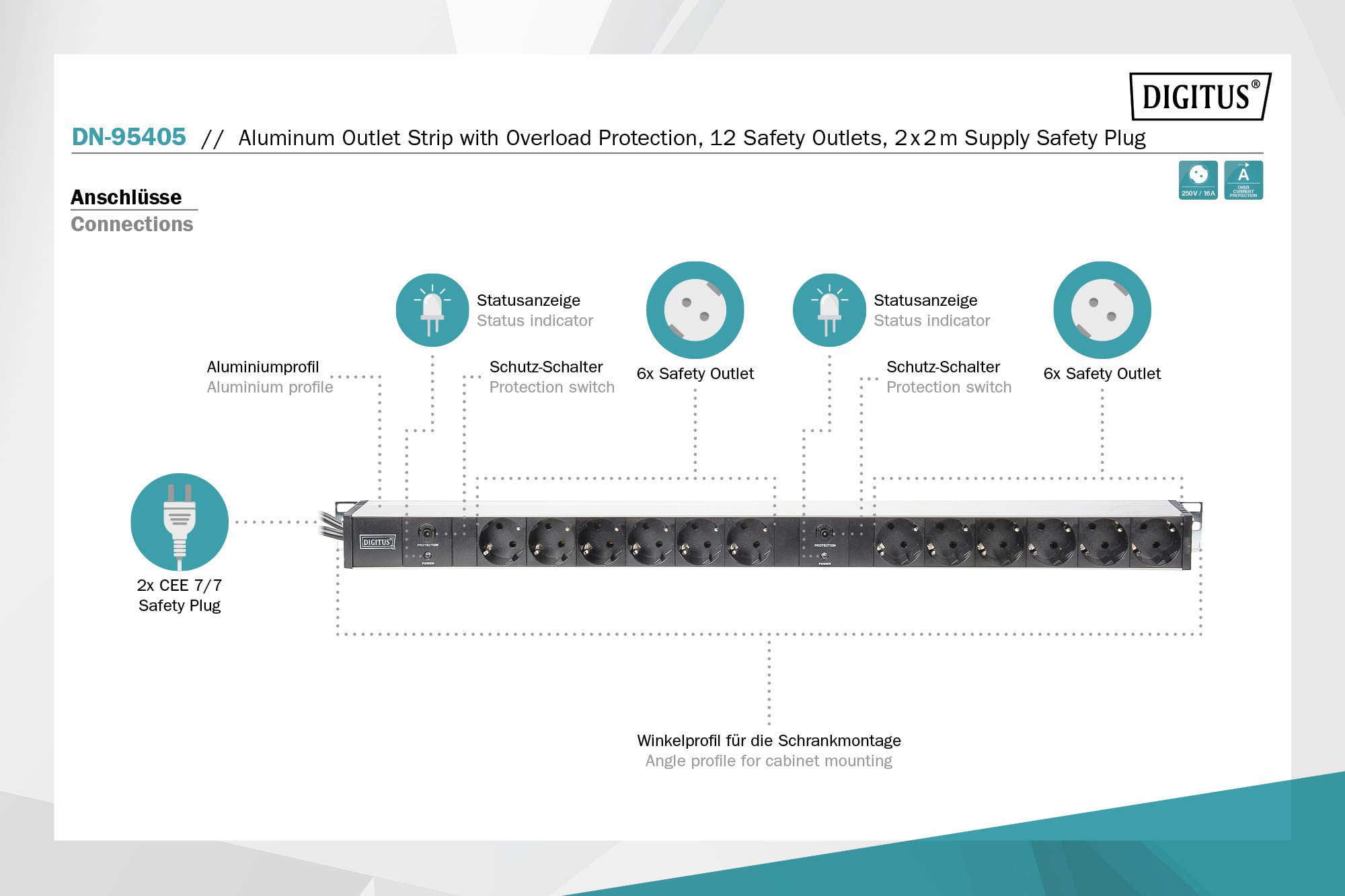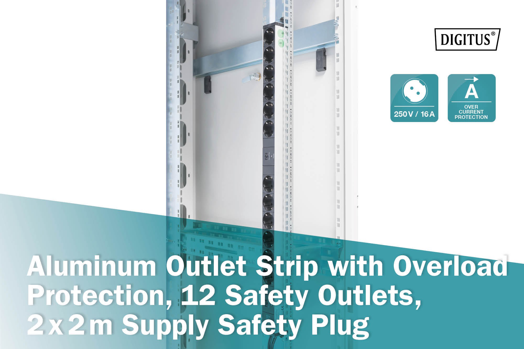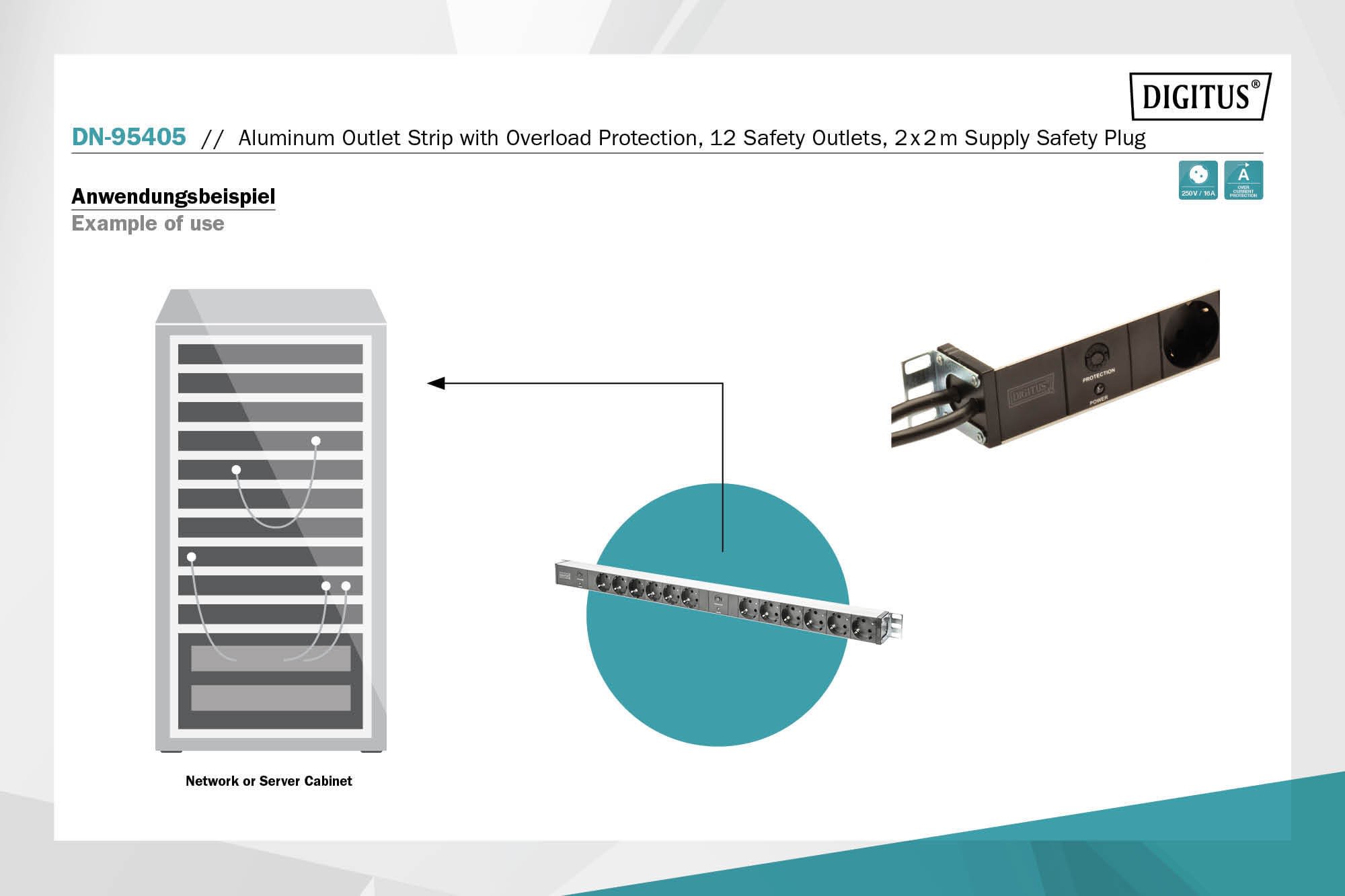 Assmann Electronic - Multiprise X12, 2 x 16A, 250 VCA 50/60Hz, protection contre les surcharges, 2x2m - DN-95405
