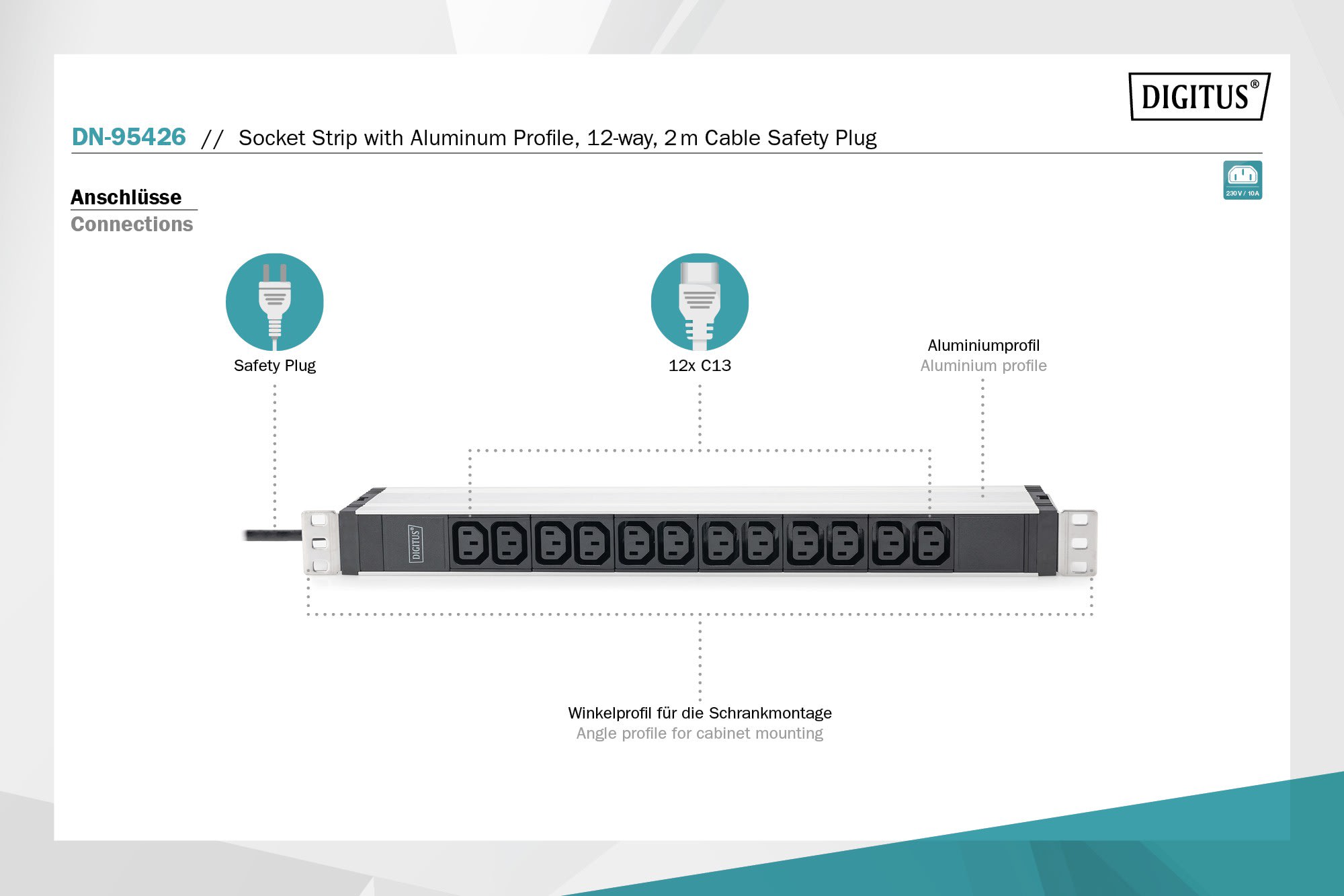 Assmann Electronic - Multiprise X12 C13 16 A, 1U, 230 VCA, 50/60 Hz, câble 2m avec fiche de sécurité - DN-95426