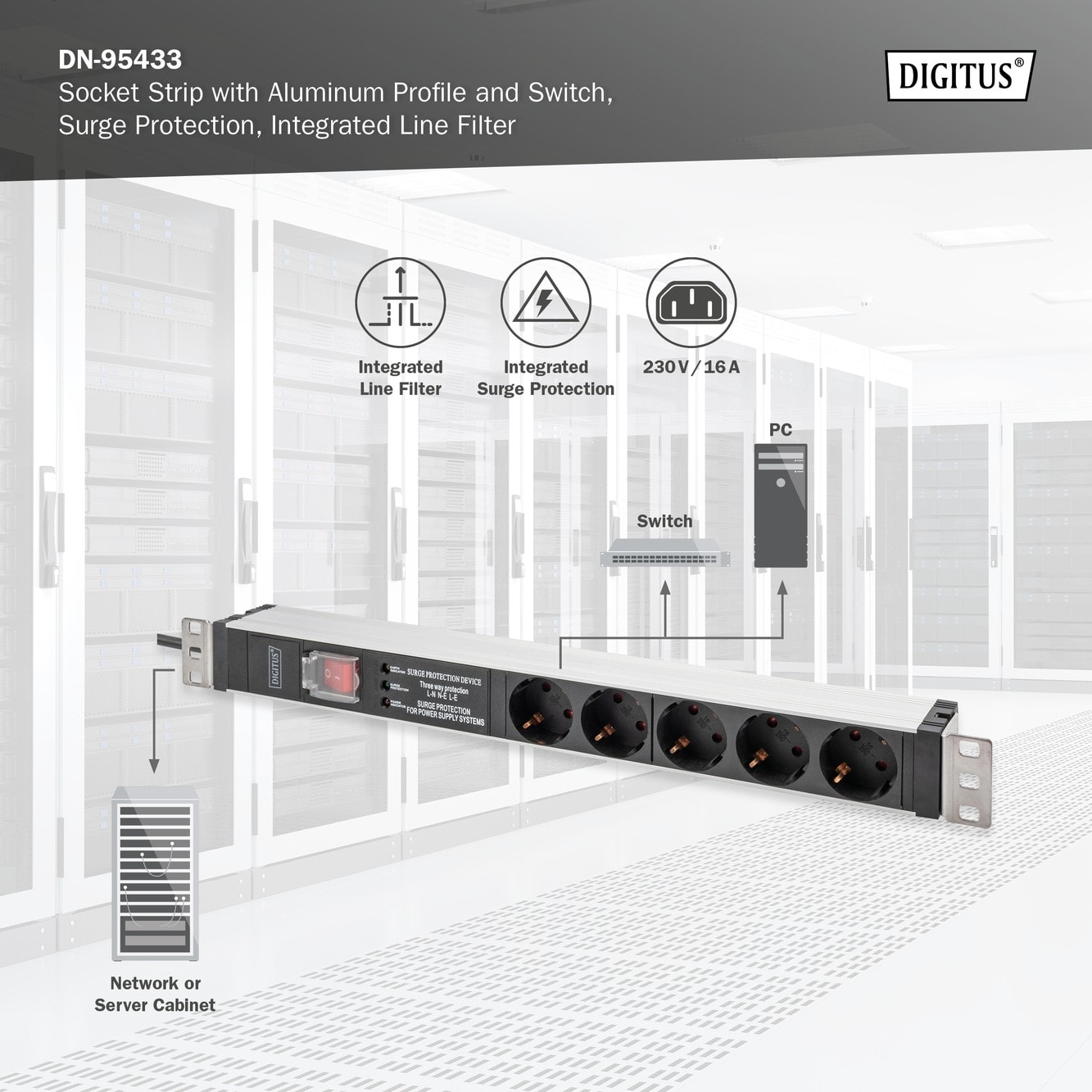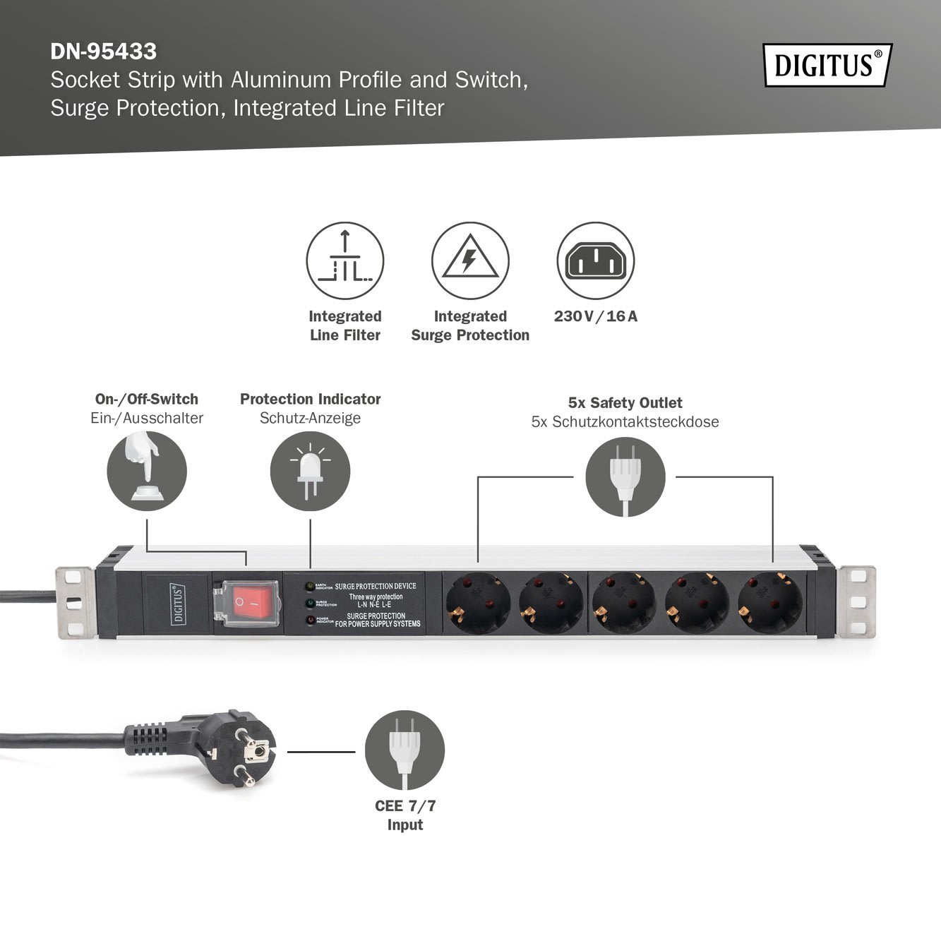 Assmann Electronic - Multiprise X5 Schuko DIN 49440, 16A, 230 VCA, 50/60 Hz, surtension interrupteur - DN-95433