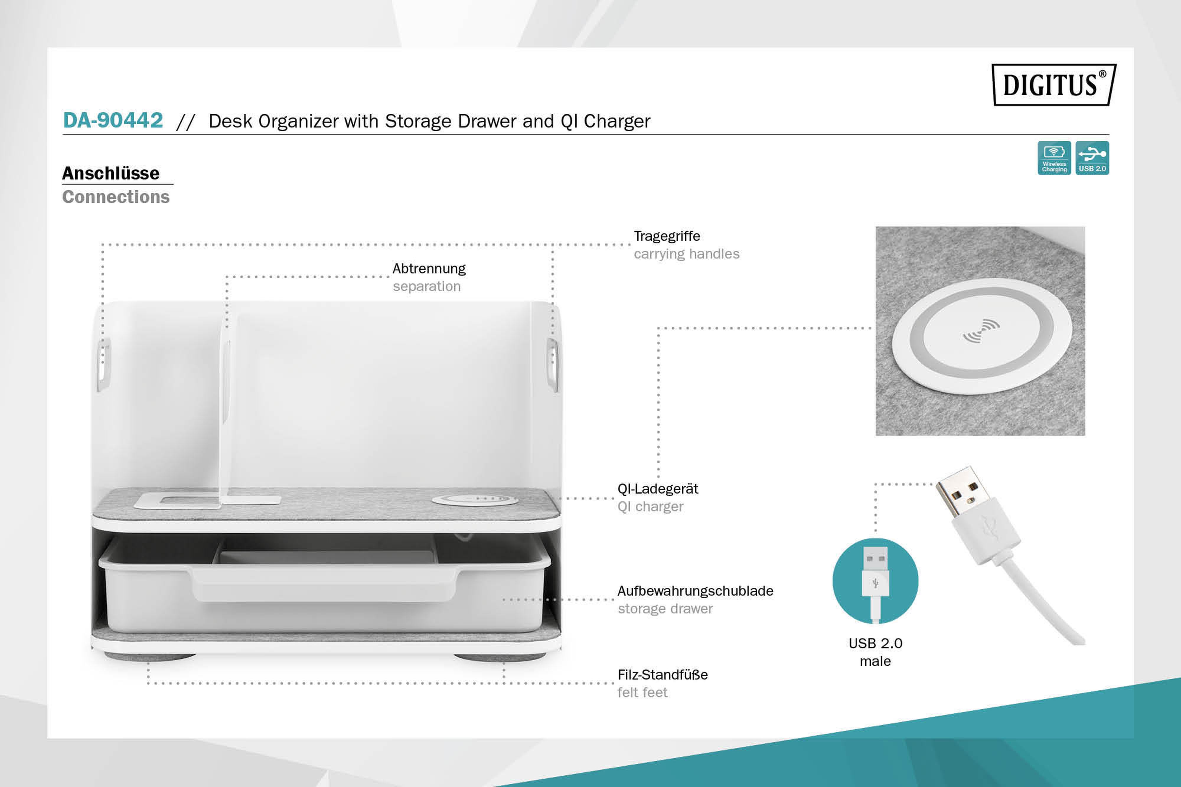 Assmann Electronic - Organiseur bureau + tiroir de rangement + chargeur QI. Blanc/gris - DA-90442