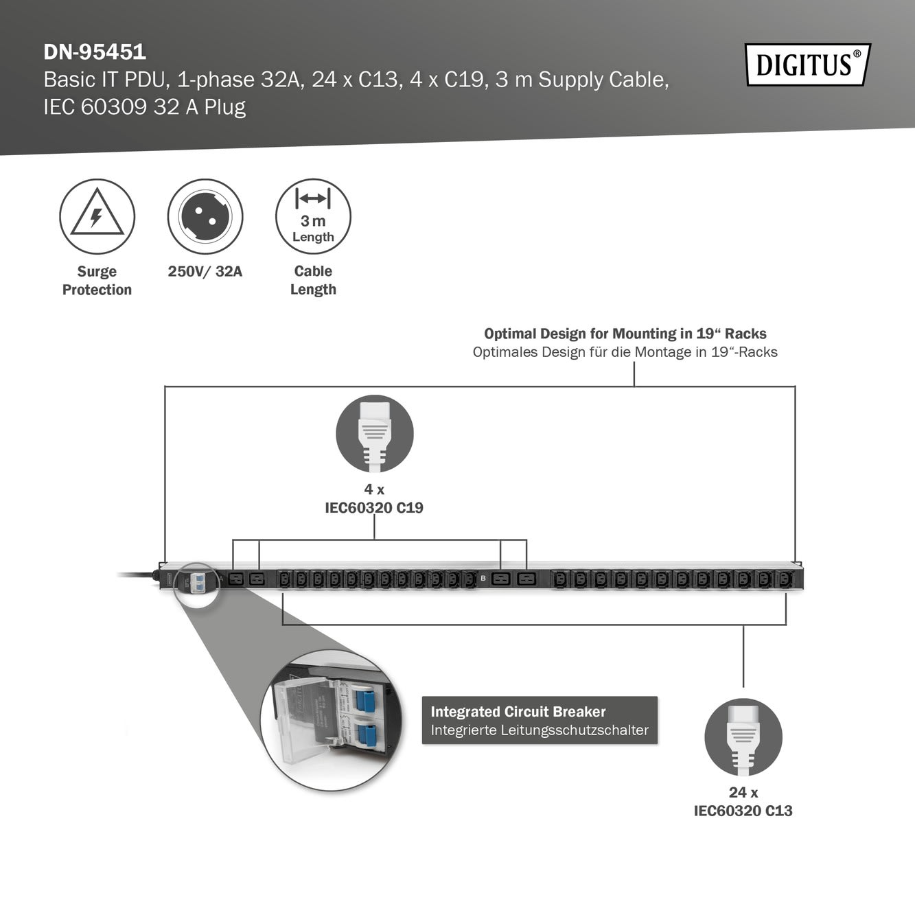Assmann Electronic - PDU vertical 32A X24C13, X4C19, câble 3m, 250 VAC (50/60Hz) 8000W - DN-95451