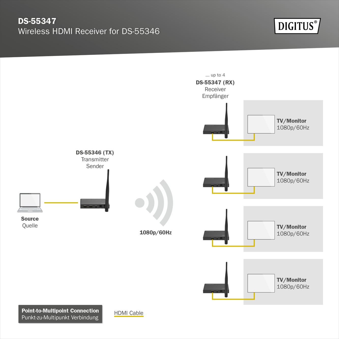 Ajoutez des unités réceptrices au kit d'extension / répartition HDMI sans fil (DS-55346) et distribuez les signaux AV sur 4 périphériques de sortie au maximum