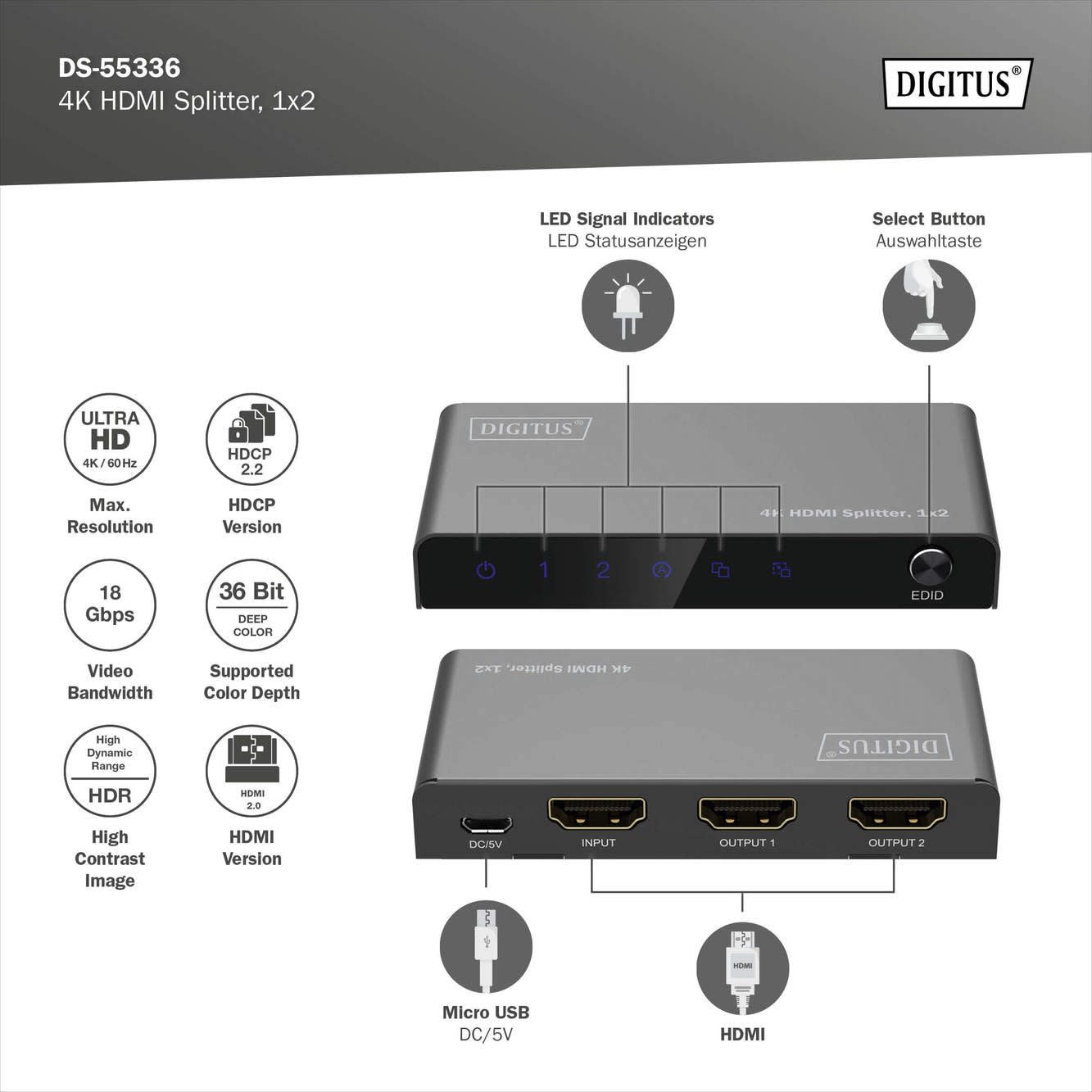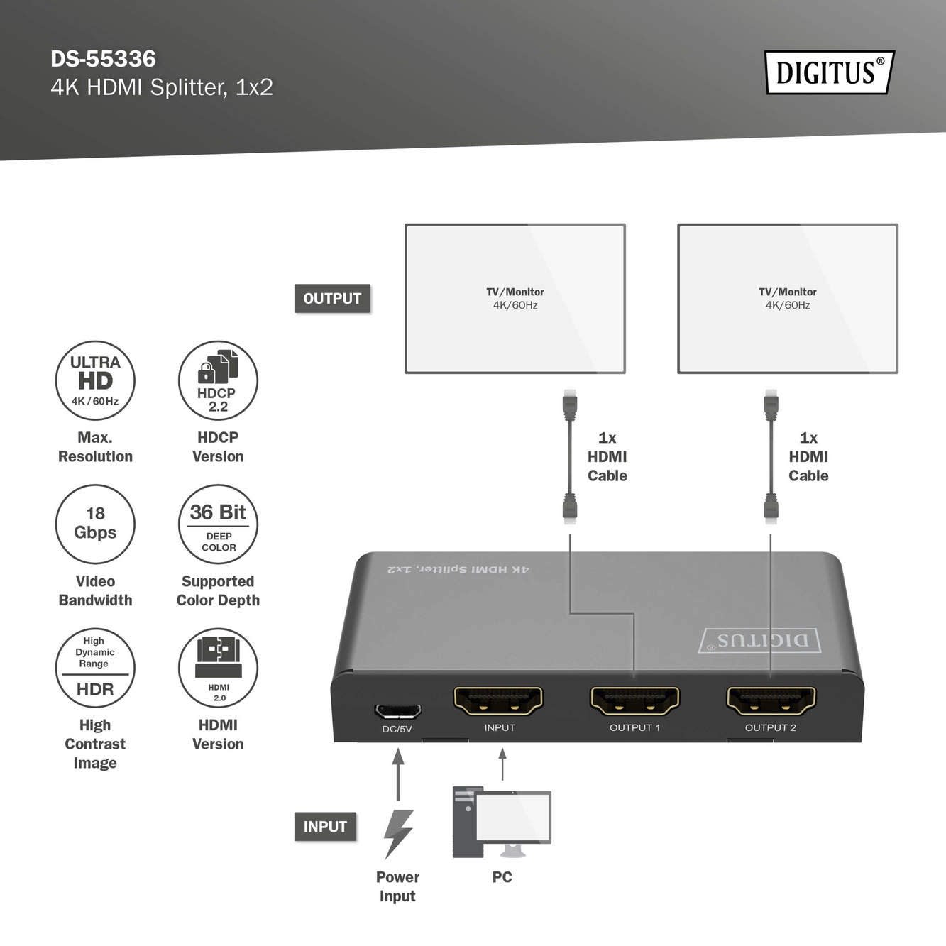 Le répartiteur HDMI de DIGITUS® distribue et reproduit les signaux audio et vidéo de votre appareil HDMI sur 2 téléviseurs, écrans ou vidéoprojecteurs avec une résolution maximale de 4K / 60 Hz.