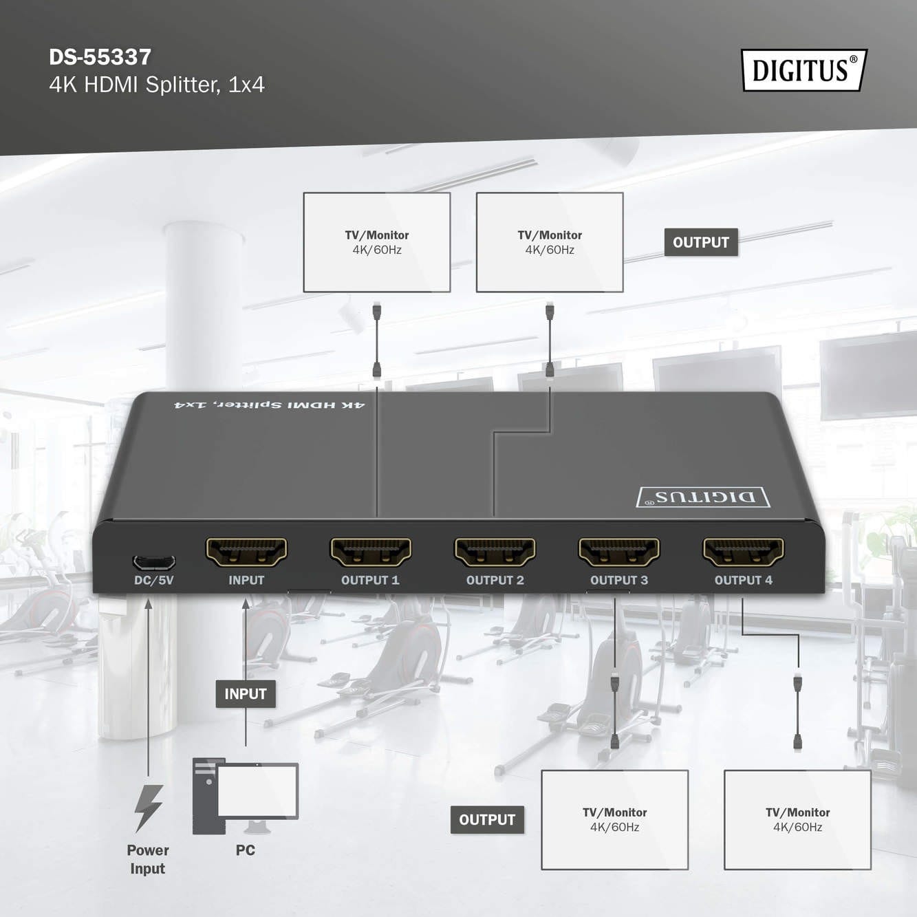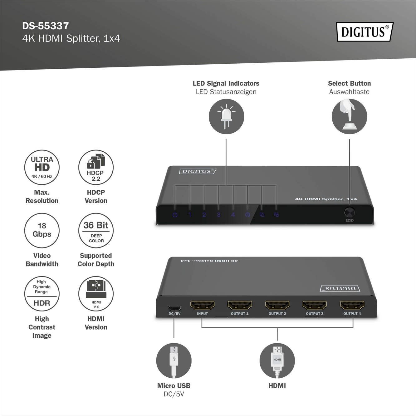 Assmann Electronic - Répartiteur HDMI 1x4, 4K / 60 Hz HDCP 2.3, gestion EDID - DS-55337