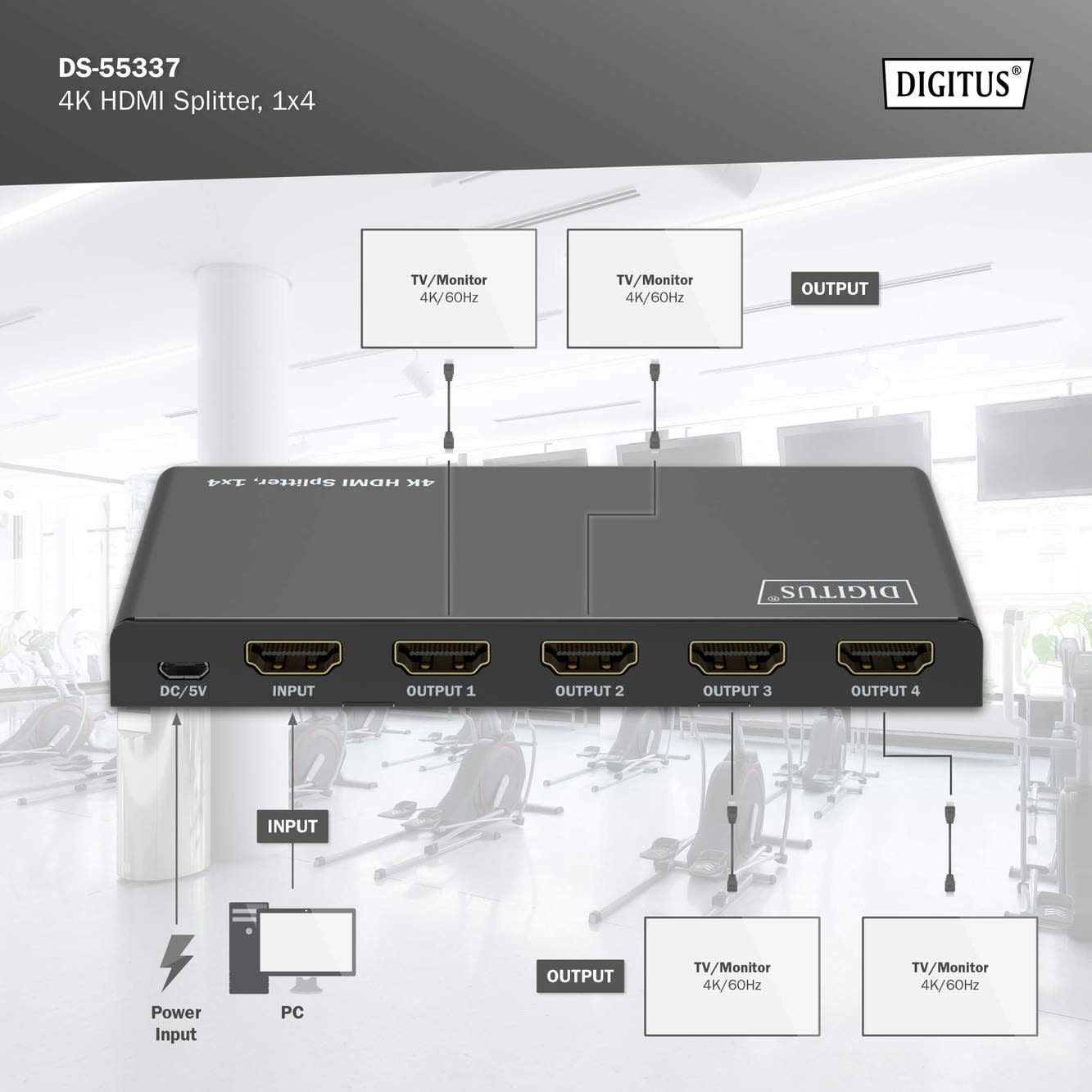 Le répartiteur HDMI de DIGITUS® distribue et reproduit les signaux audio et vidéo de votre appareil HDMI sur 4 téléviseurs, écrans ou vidéoprojecteurs avec une résolution maximale de 4K / 60 Hz.