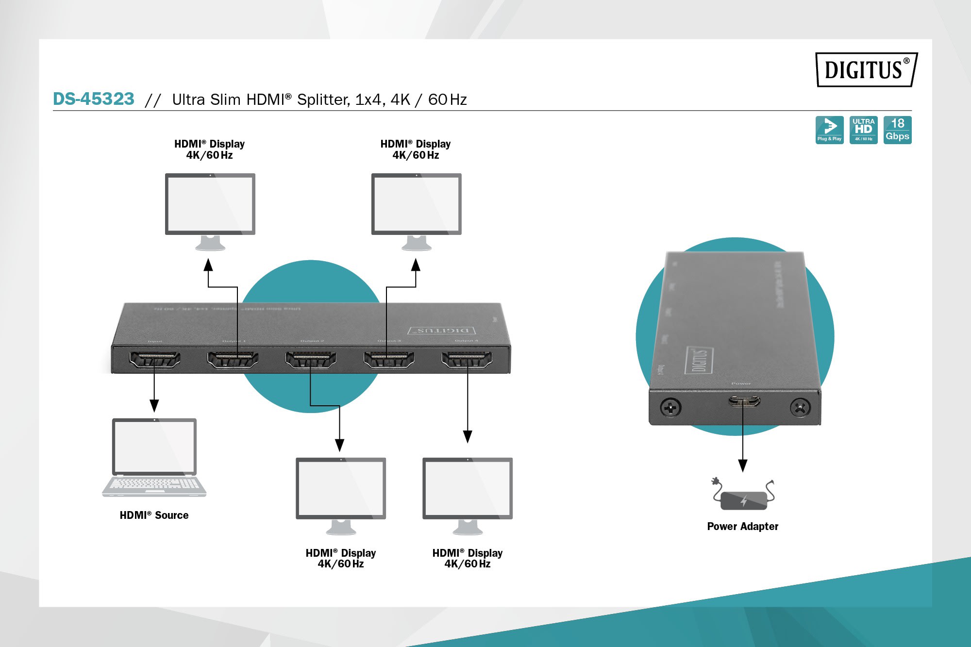 Assmann Electronic - Séparateur HDMI ultraplat 1x4 4K/60Hz HDR, HDCP 2.2, 18G alim. Micro USB - DS-45323