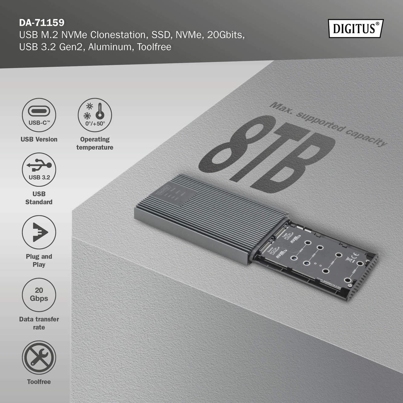 Assmann Electronic - Station de clonage NVMe, NVMe, 20Gbits USB 3.2 Gen2, aluminium, sans outil - DA-71559