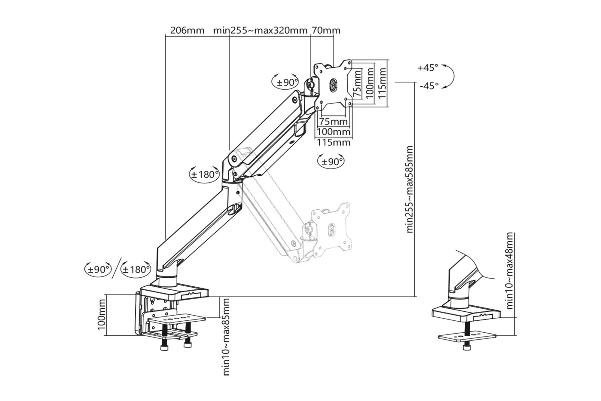 Le support vous permet d'orienter séparément des écrans jusqu'à 35". Il est possible de faire pivoter l'écran, de l'incliner et de le tourner. Le ressort à gaz intégré facilite le réglage de la hauteur. Avec fonction Quick Release.