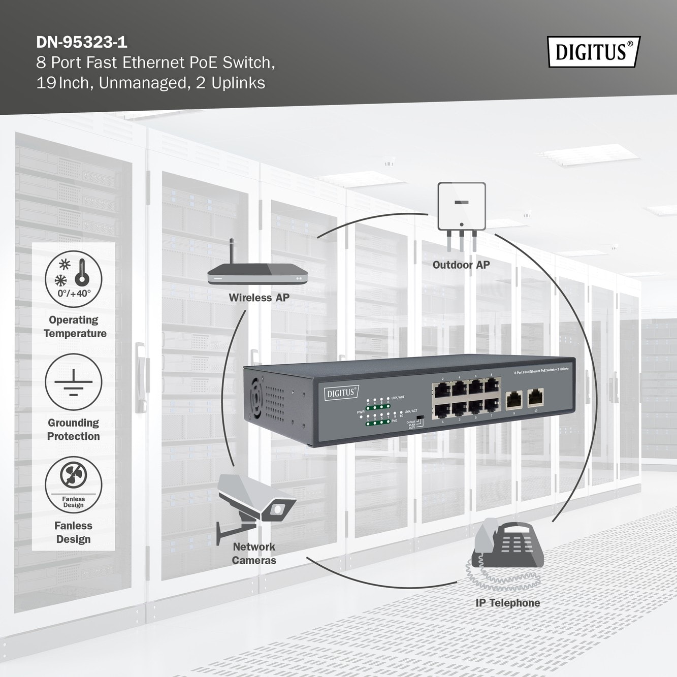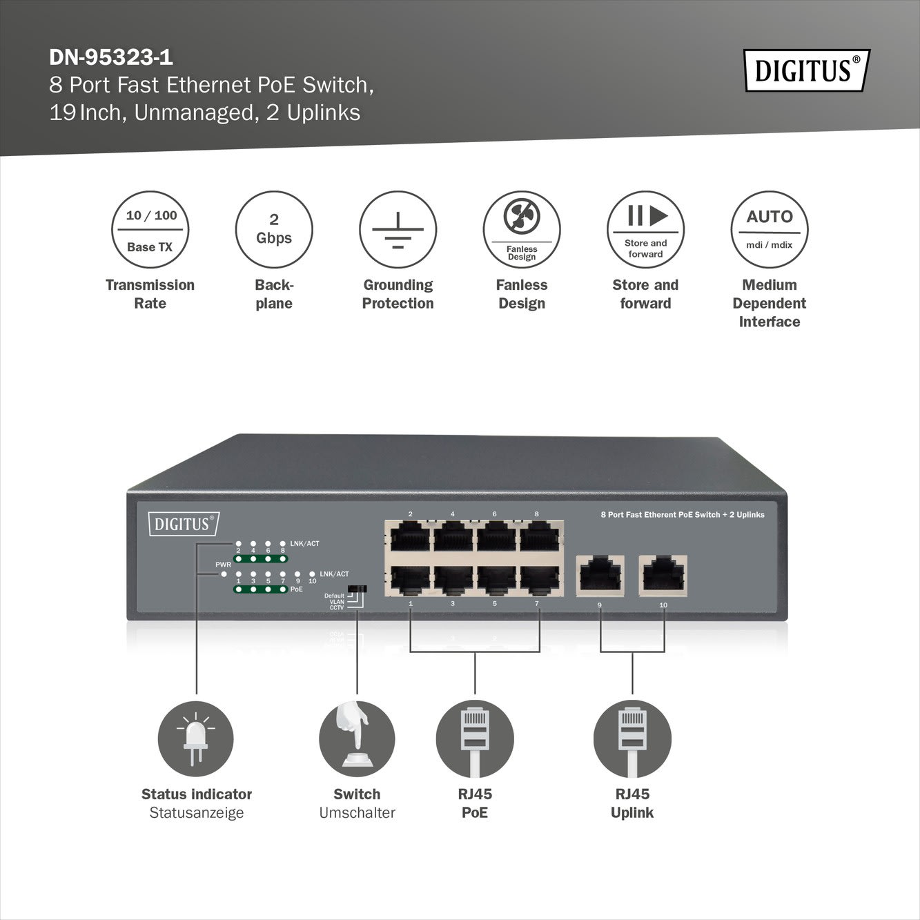 Assmann Electronic - Switch Fast Ethernet non géré Poe 8 ports 2ports uplink RJ45 120W, af/at+ - DN-95323-1