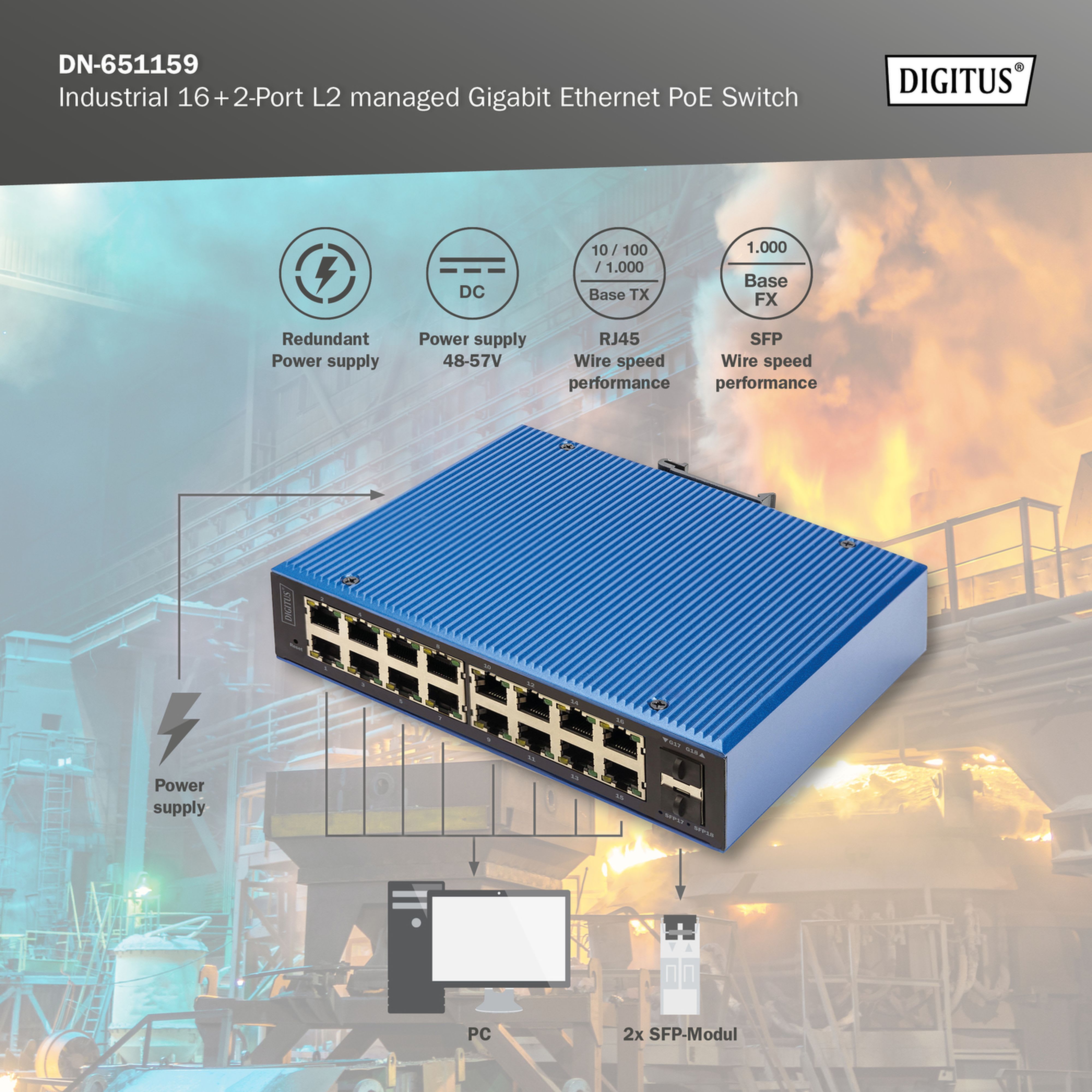 Assmann Electronic - Switch ind. 16+2 ports L2 géré PoE 16 x GE RJ45+2 ports SFP, IEEE802.3at 30W - DN-651159