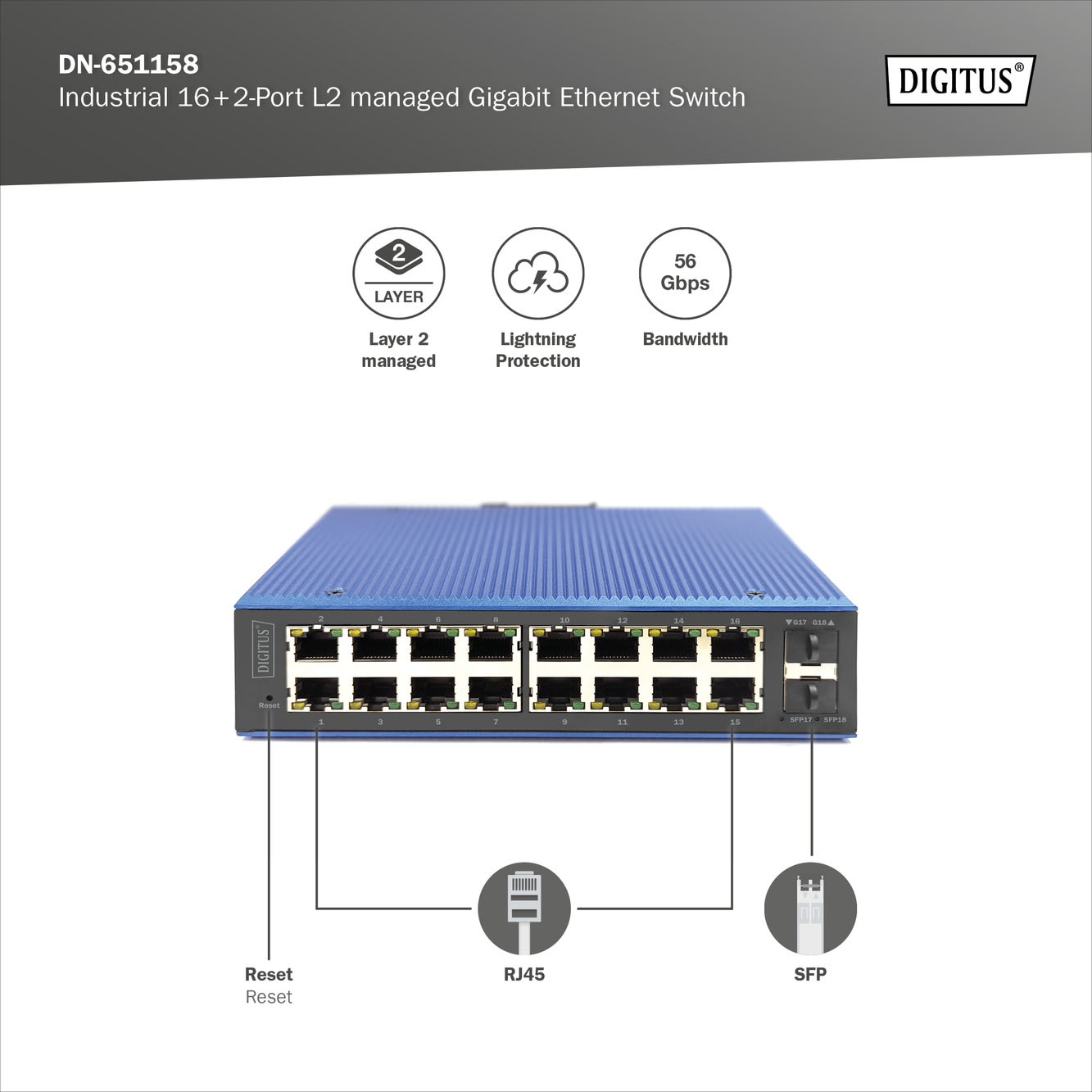 Assmann Electronic - Switch ind.Gigabit Ethernet L2 Managed 16+2 ports 16 ports RJ45 GE + 2 ports SFP - DN-651158