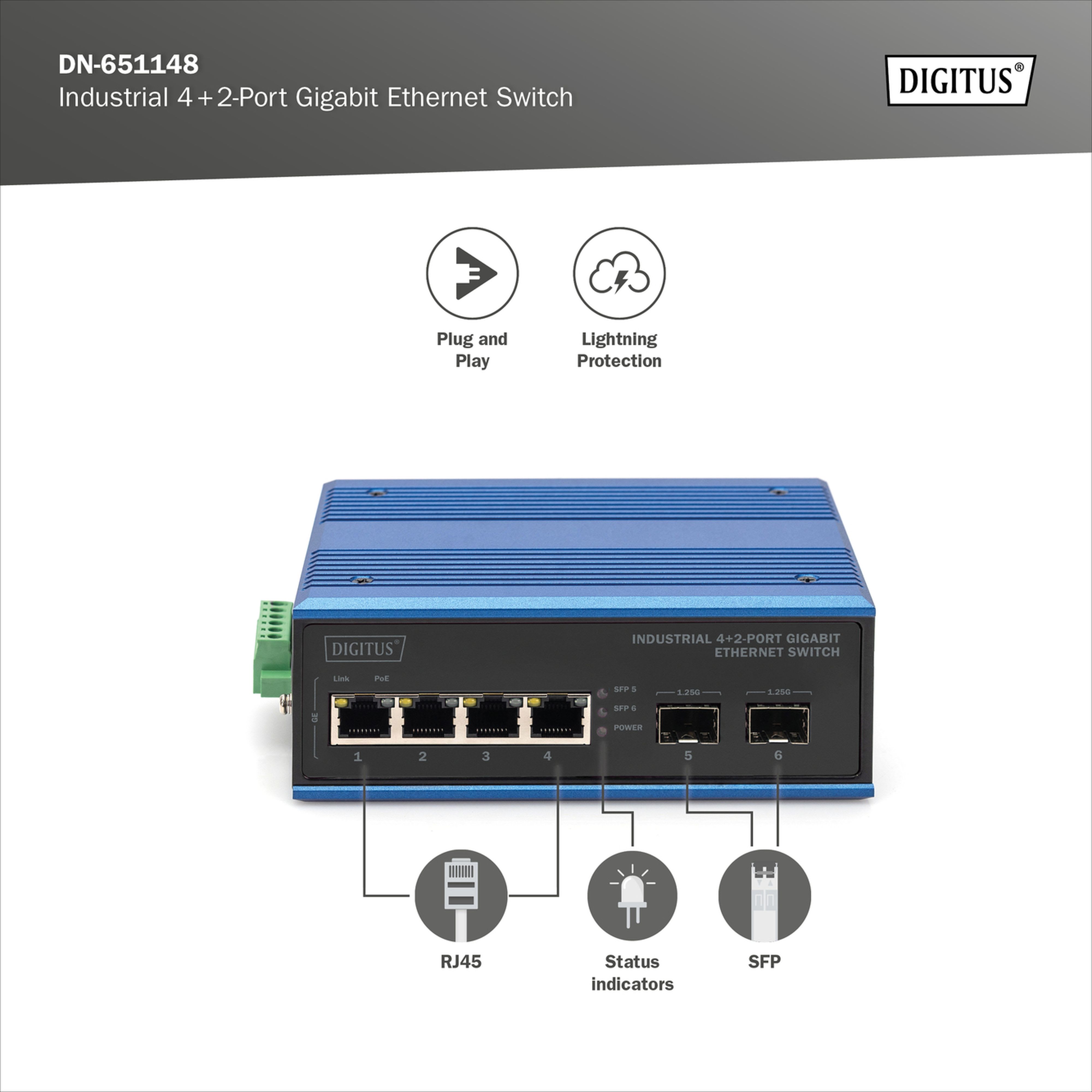 Assmann Electronic - Switch industriel 4+2 ports Gigabit Ethernet 4 ports GE RJ 45, 2 ports GE SFP - DN-651148