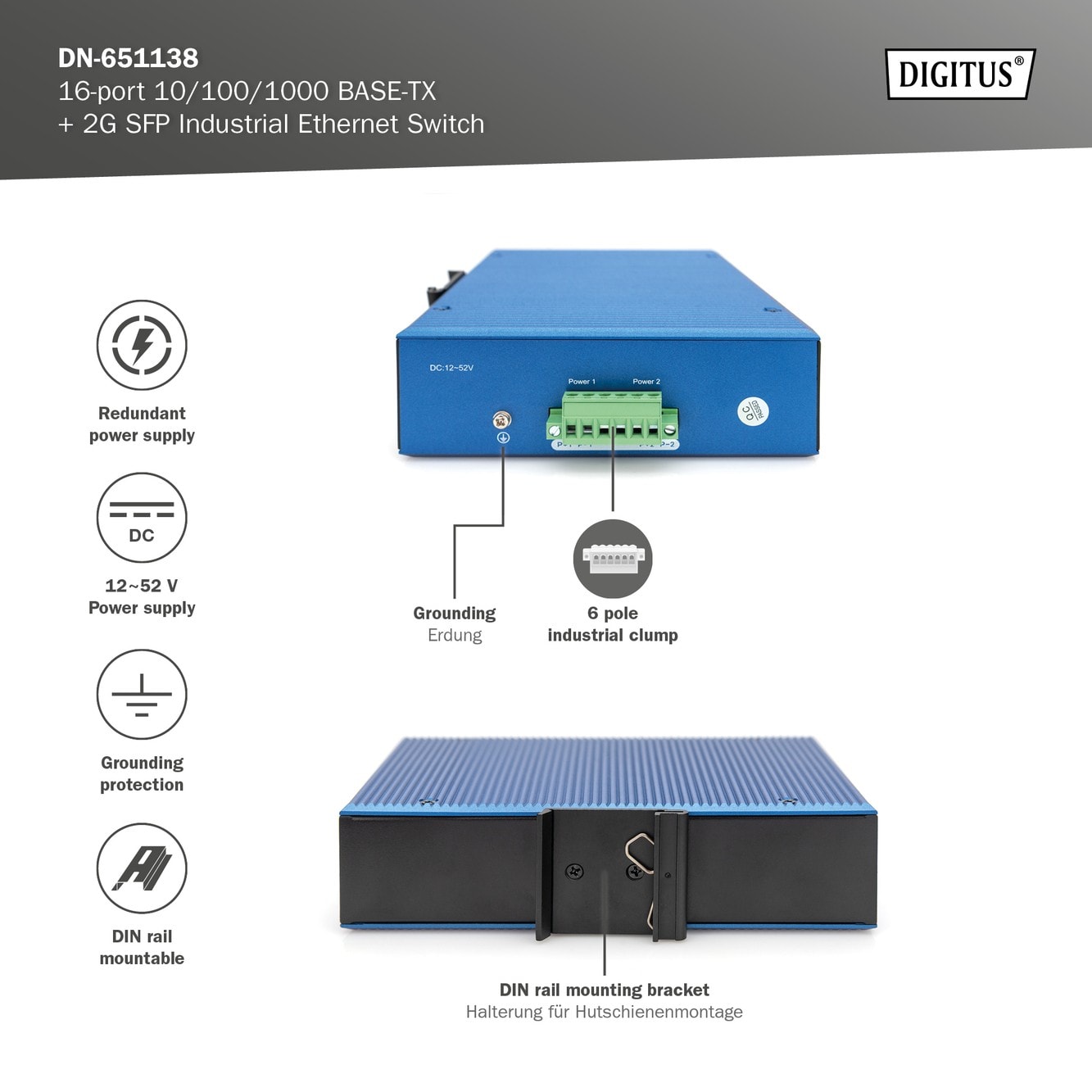 Assmann Electronic - Switch industriel Gigabit Ethernet 16+2 ports non géré, RJ45 10/100/1000 Mbit/s - DN-651138