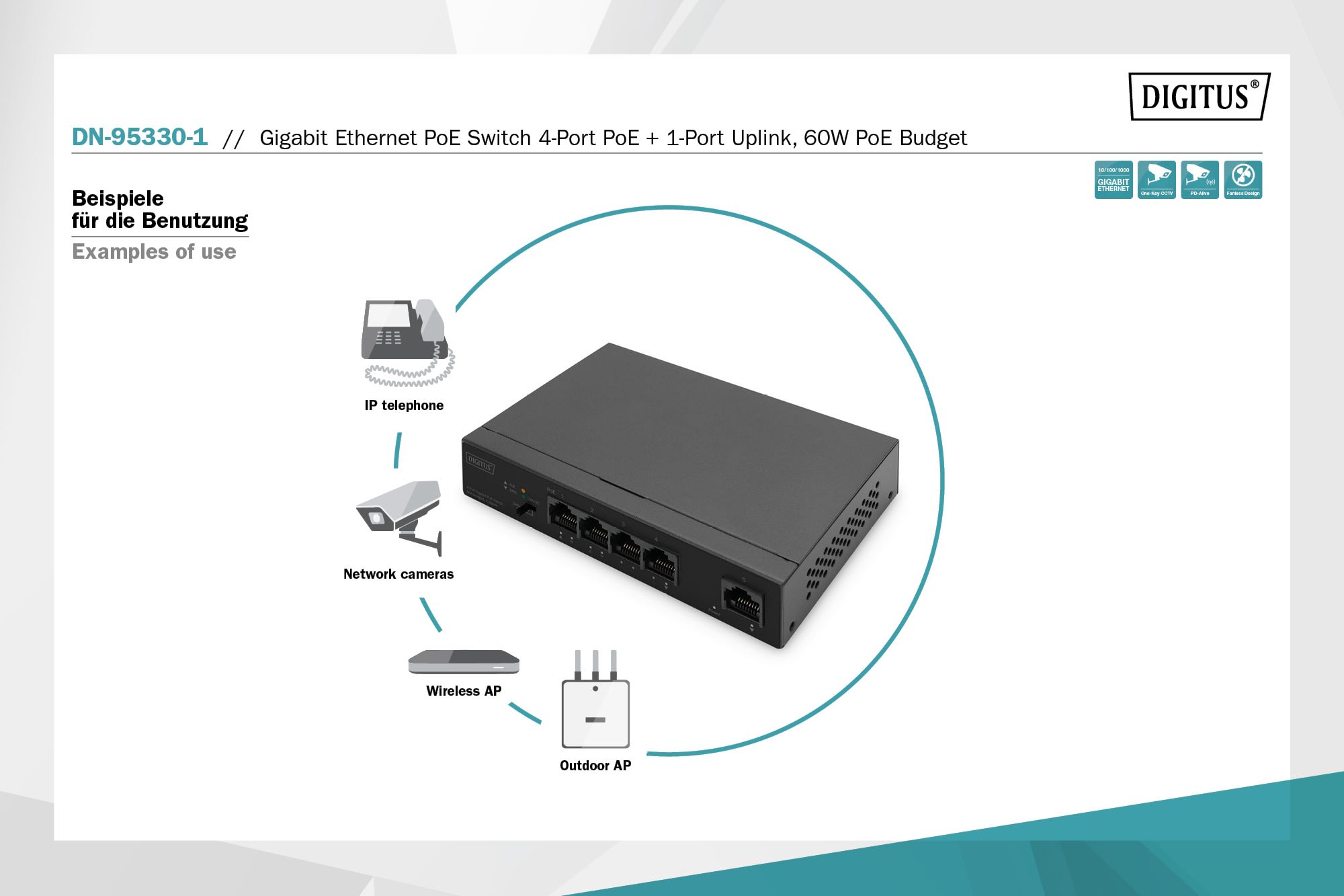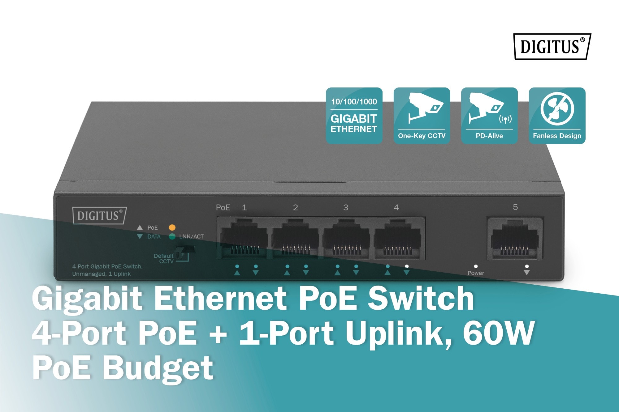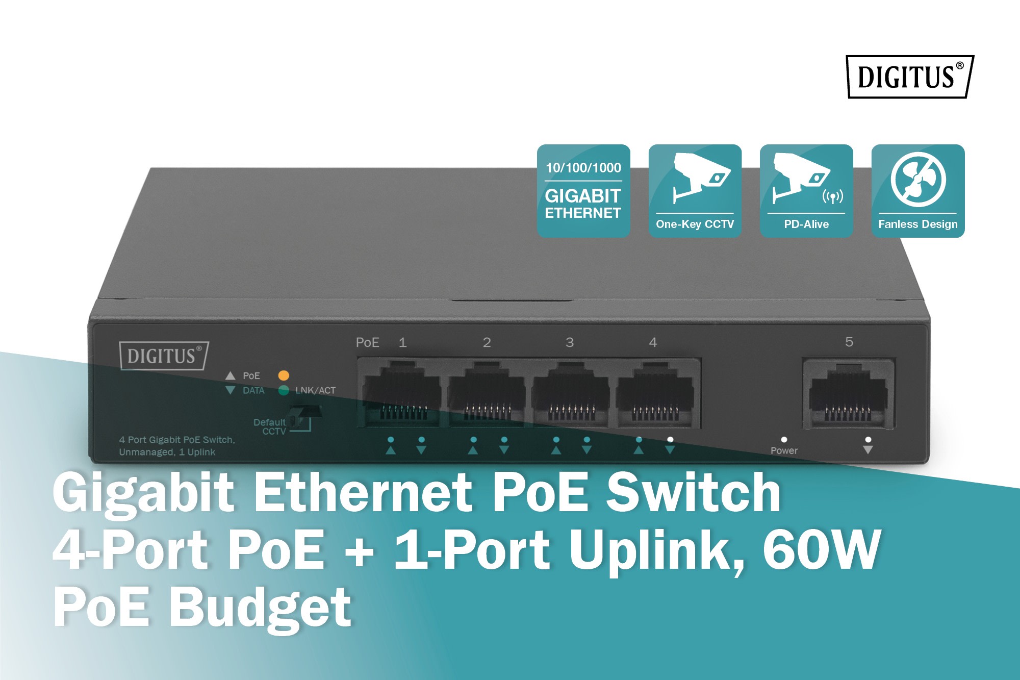 Commutateur Gigabit Ethernet PoE, 4 ports PoE + 1 port uplink, Budget PoE de 60 W