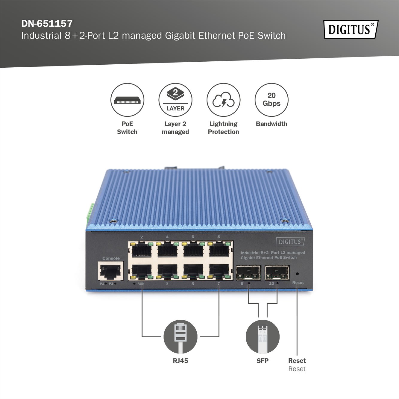 Assmann Electronic - Switch PoE Gigabit L2 géré Ethernet 8 x GE RJ45 + 2 ports SFP, IEEE802.3at 30W - DN-651157