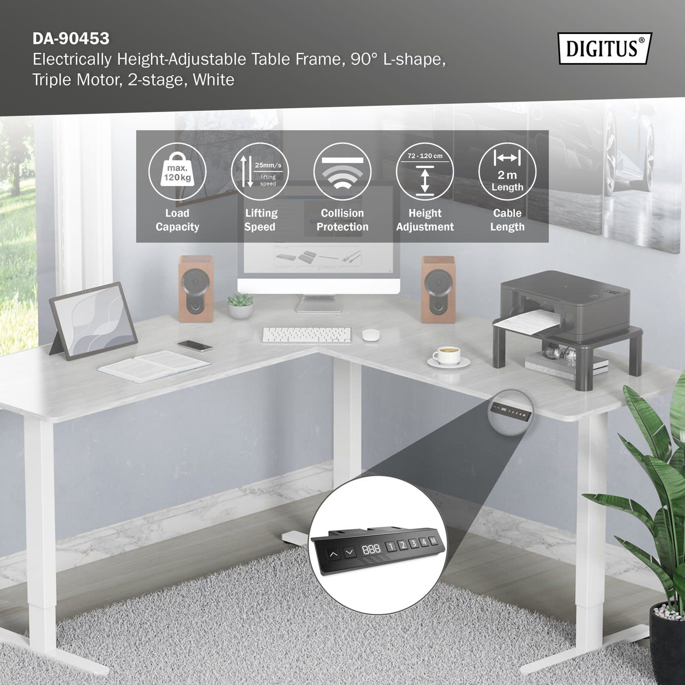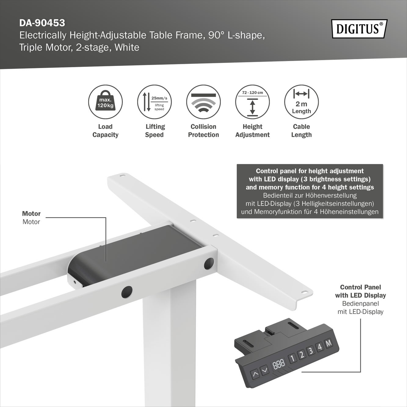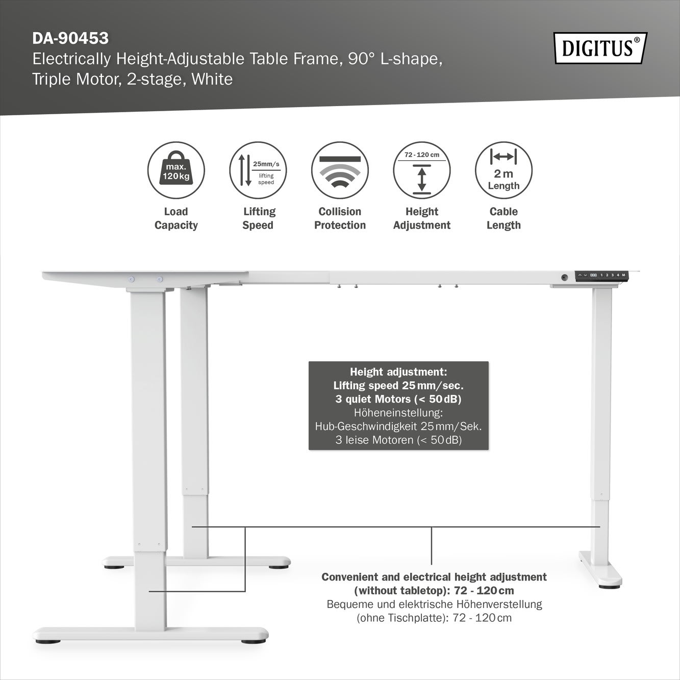 Assmann Electronic - Table réglable en hauteur électrique en L ,Hauteur 124-208 cm, 120 kg max blanc - DA-90453
