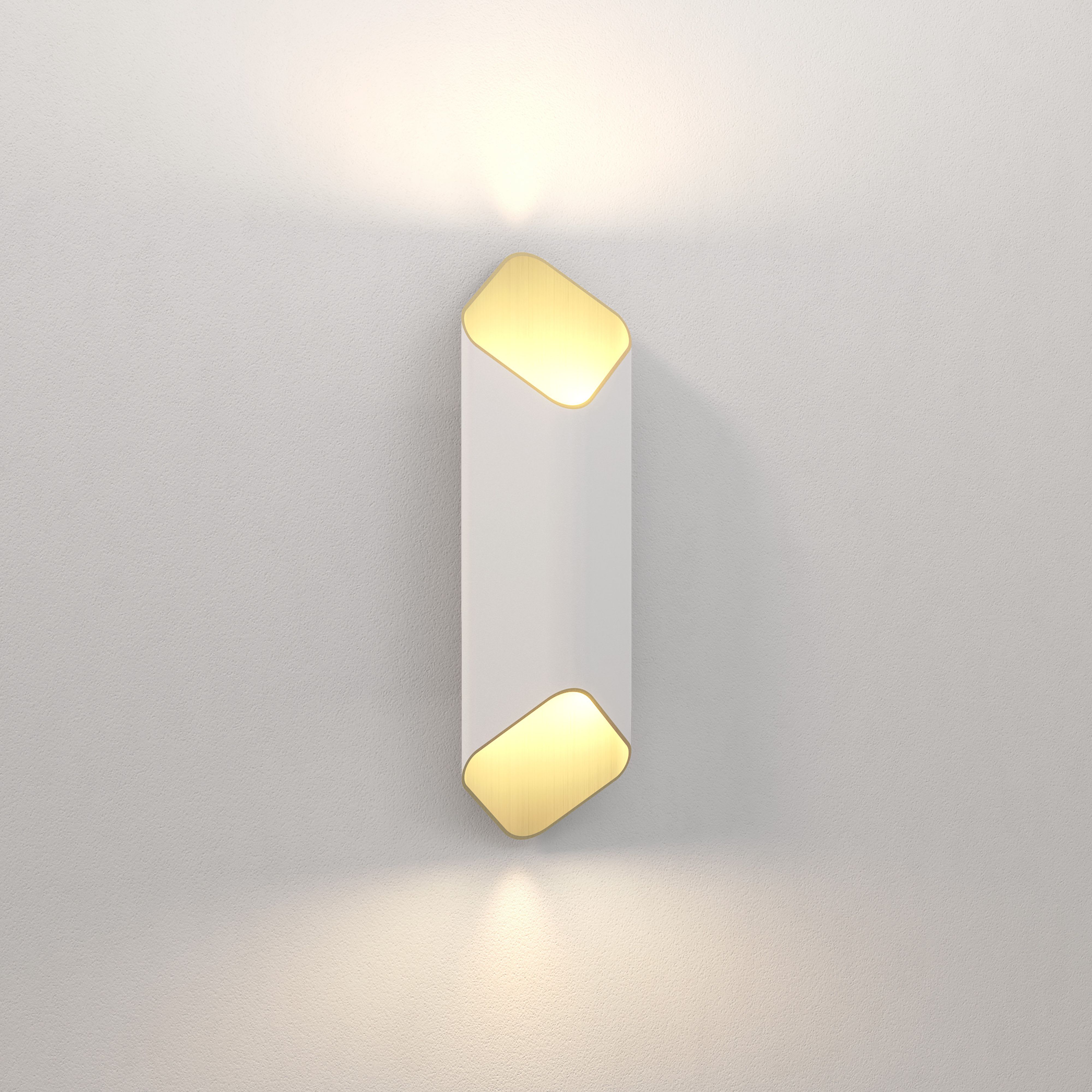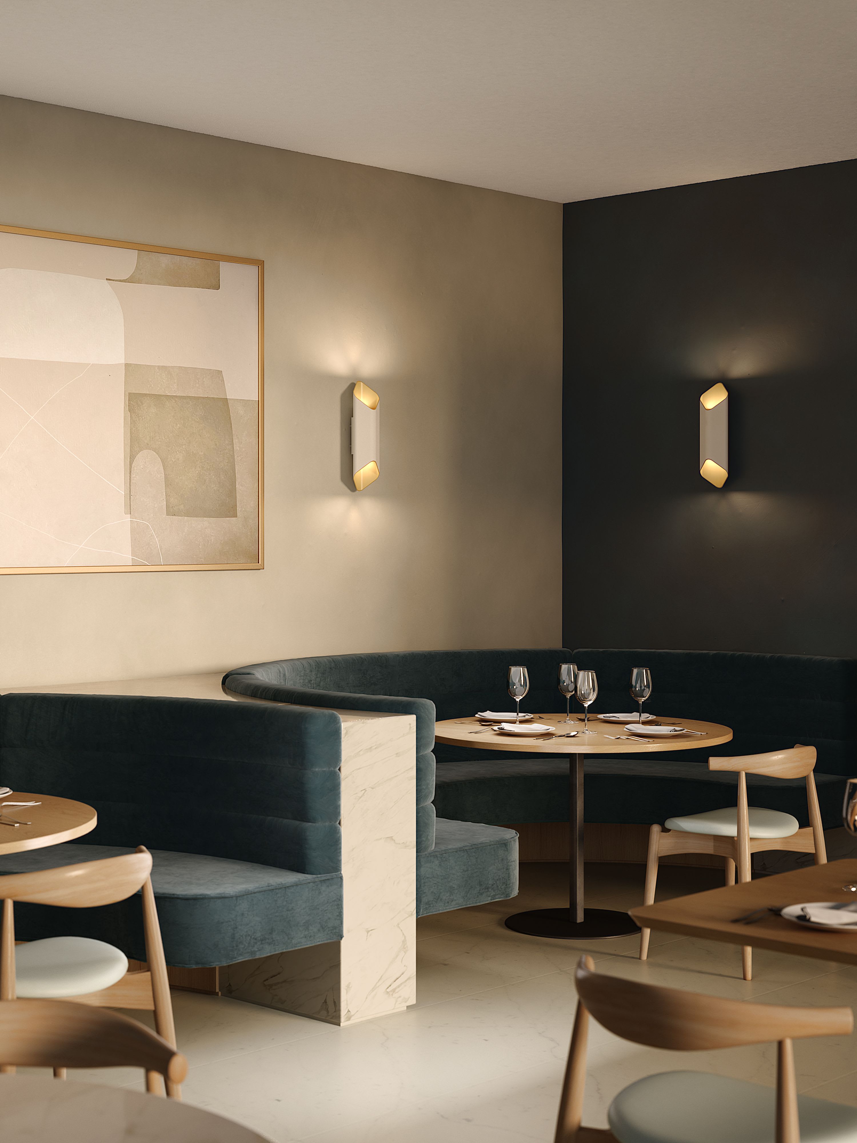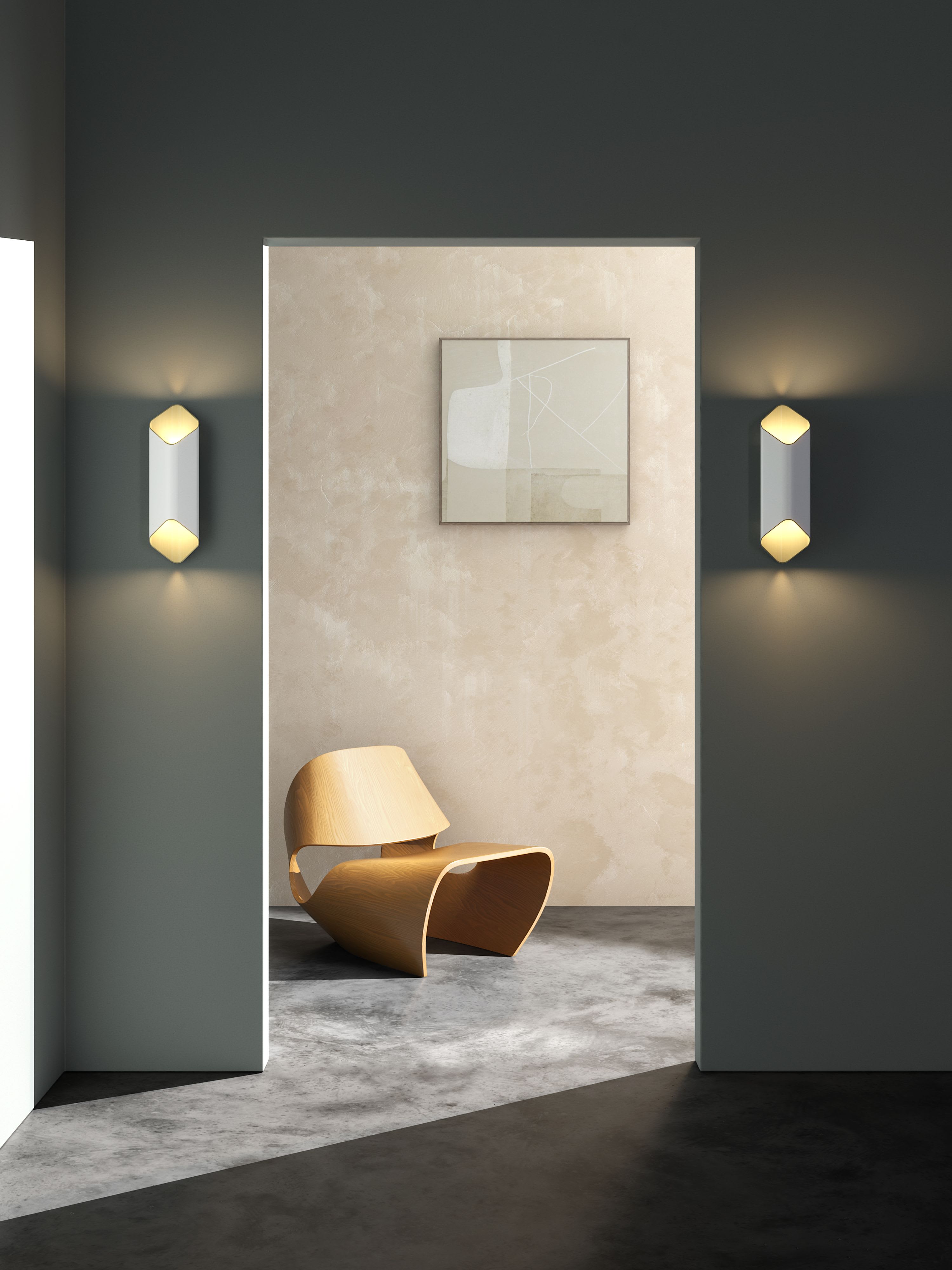 Avec sa riche finition or et blanc mat, Ako ajoute un accent architectural luxueux aux murs des couloirs et des espaces d'accueil. Son diffuseur en polycarbonate opalescent projette une douce lumière sur le mur sans angles prononcés.