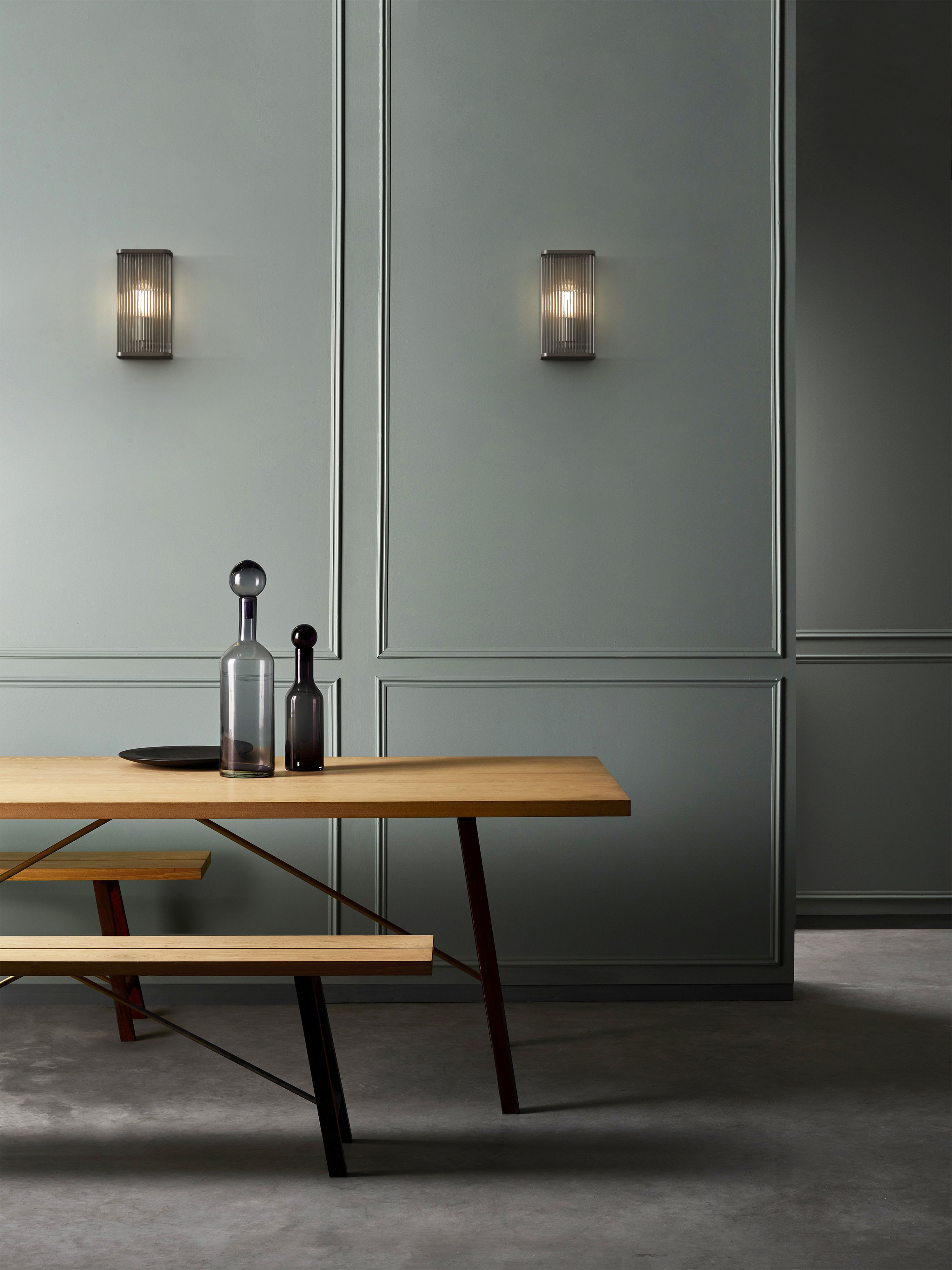 Inspirée des luminaires art déco, les imposantes dimensions de l'applique Avignon Square 300 font instantanément sensation, marquant tout espace de sa présence. Longue et filiforme, dotée d'un profil parfaitement défini, elle se compose de tiges en verre transparent et étincelant et d'embouts en bronze moulé sous pression. Elle émet un éclairage d'ambiance, sans éblouir. Pensée pour les environnements hôteliers, ce luminaire se fixe au mur via une seule vis discrète, afin que rien ne vienne détourner le regard de son esthétique uniforme.