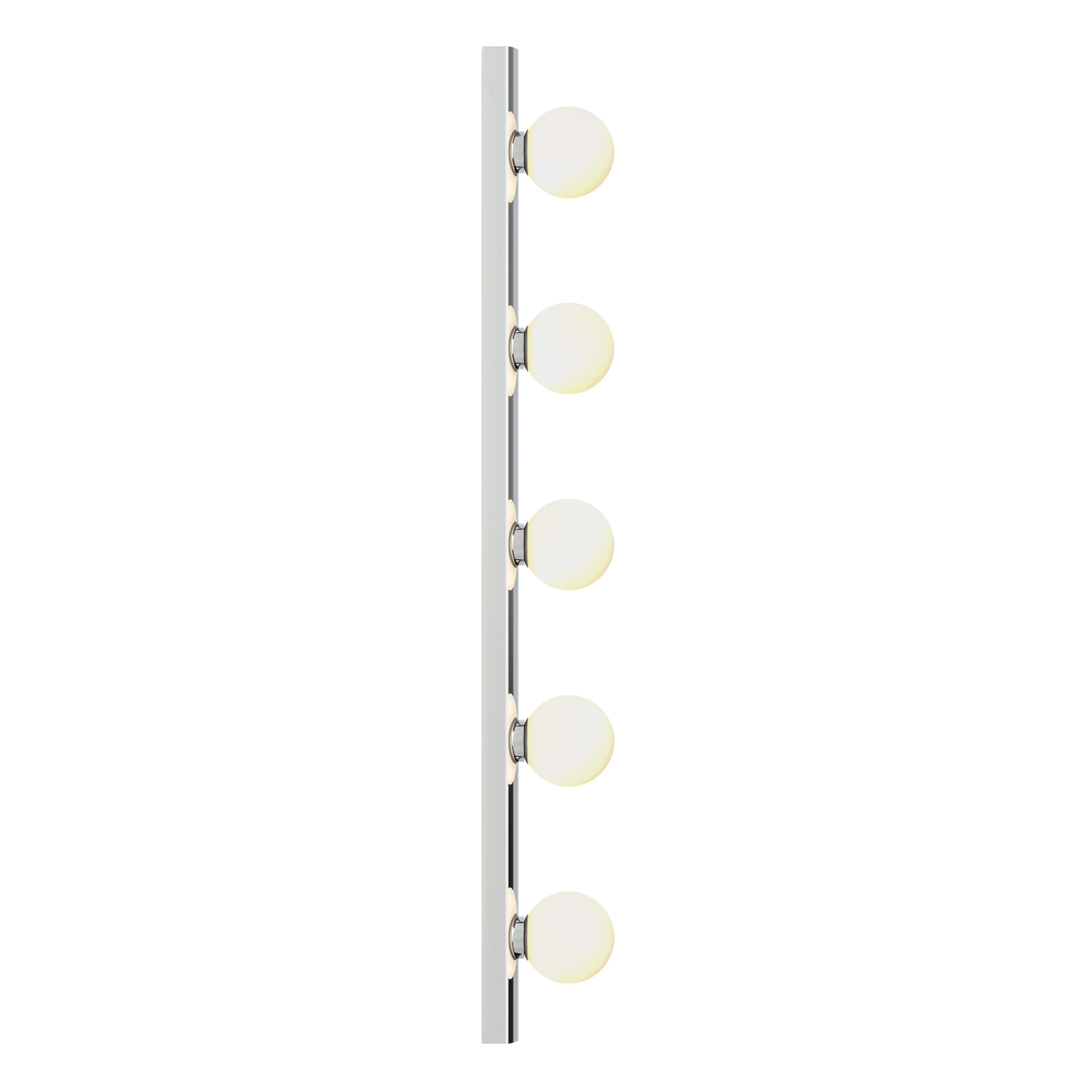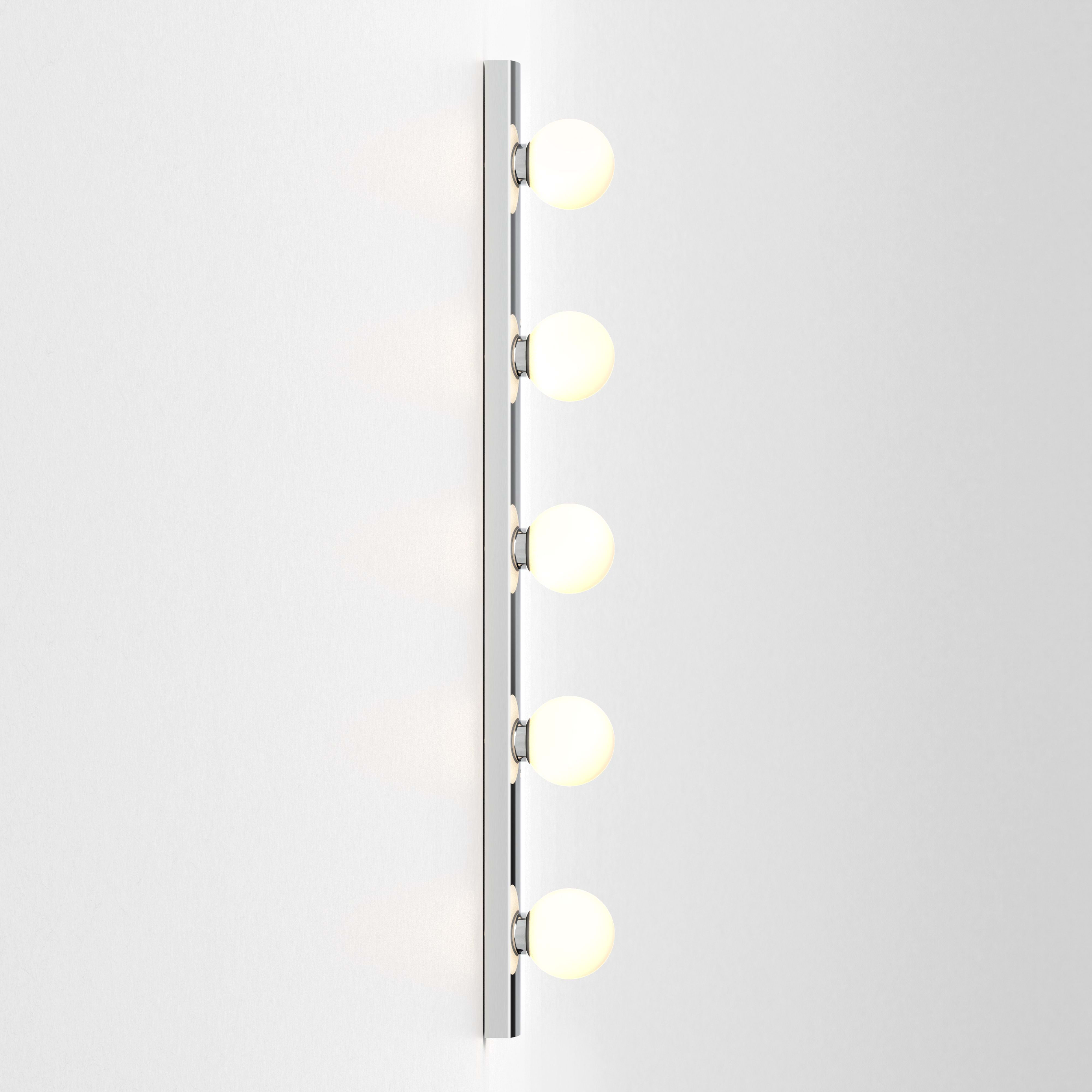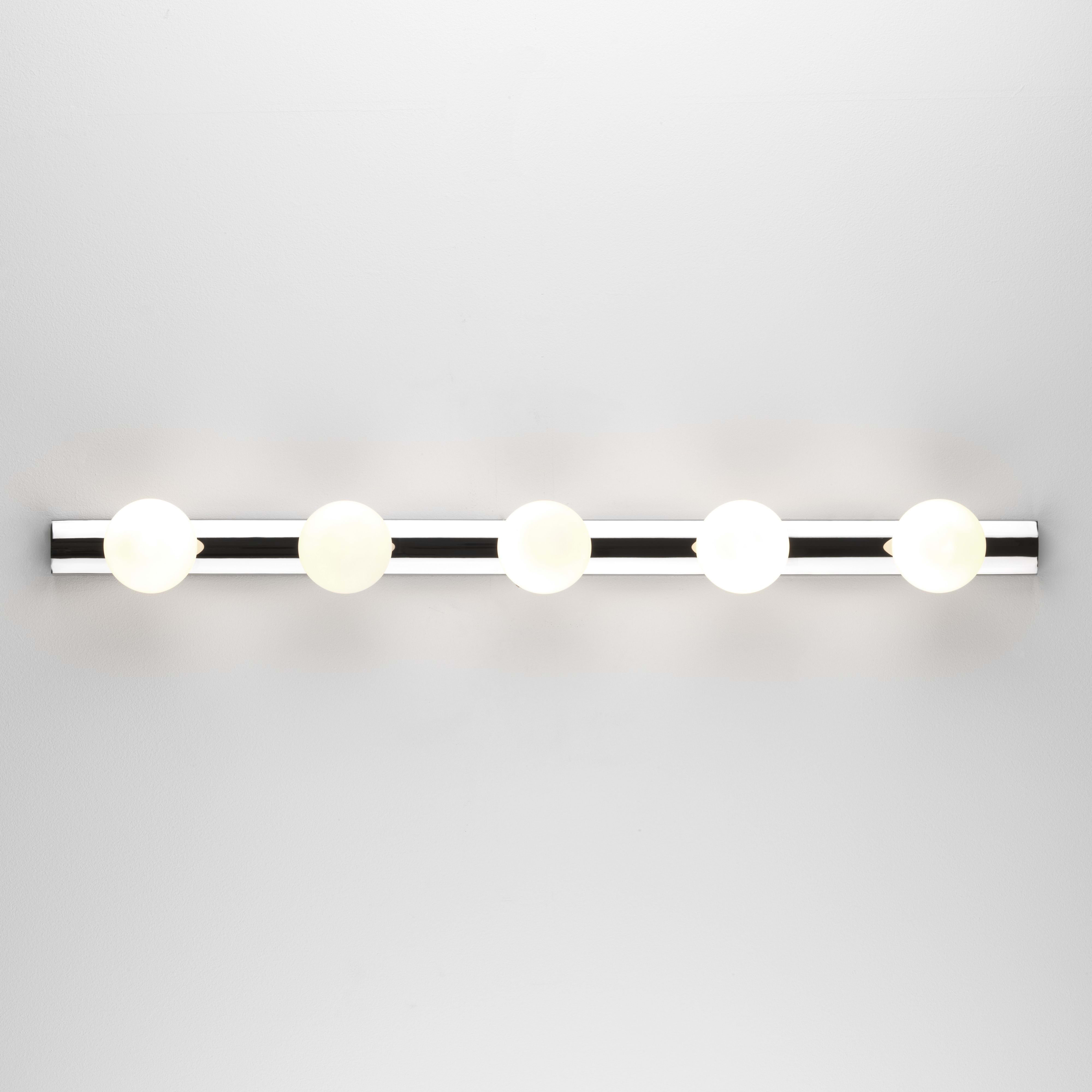 Interprétation contemporaine du miroir hollywoodien classique, cette applique est dotée d'un corps filiforme en chrome poli et de globes à LED en verre soufflé pour un éclairage vif et uniforme. Destinée aux salles d'eau ou dressings, elle peut être positionnée horizontalement comme verticalement autour d'un miroir. Elle est fournie non commutée pour fonctionner sans souci avec les systèmes d'éclairages intégrés.