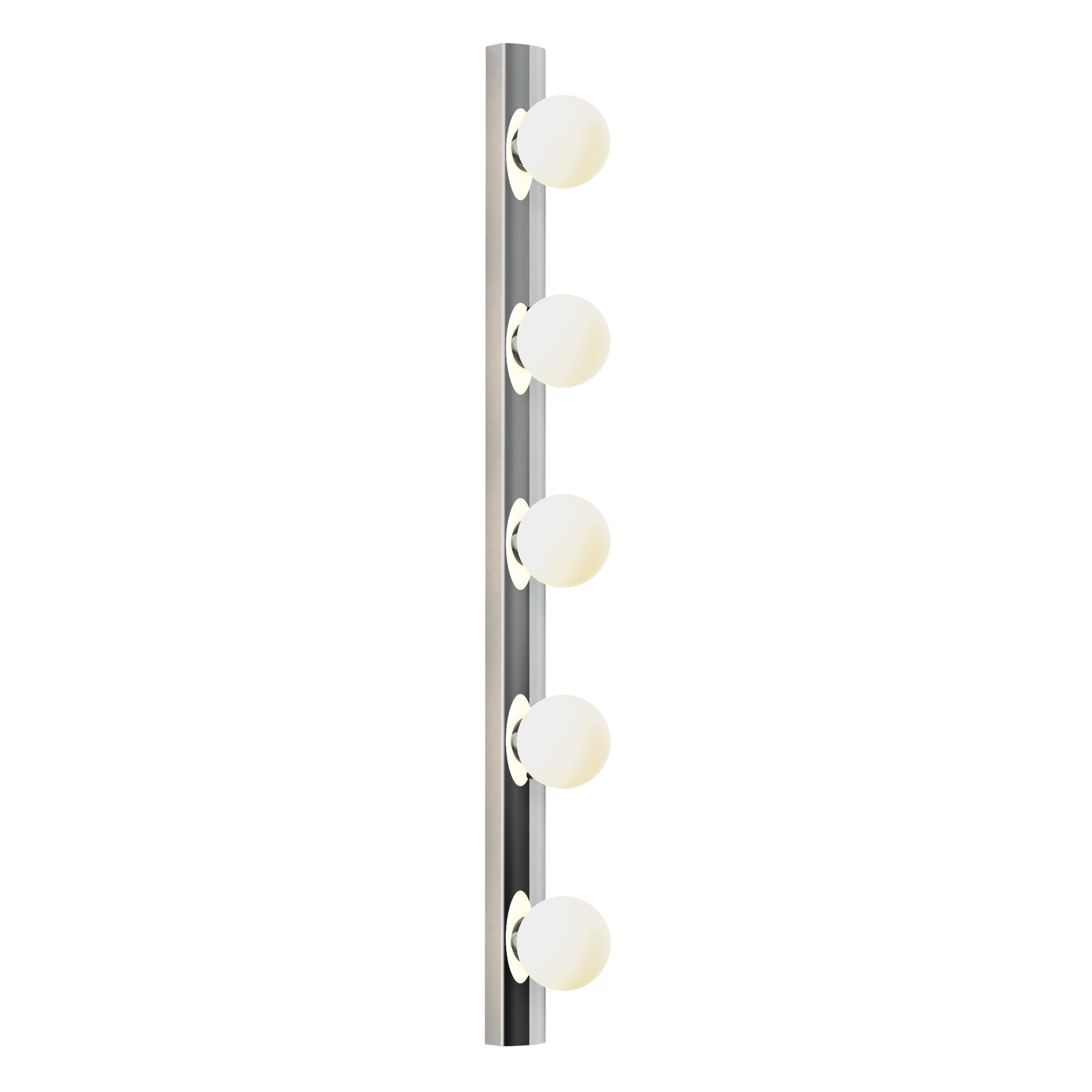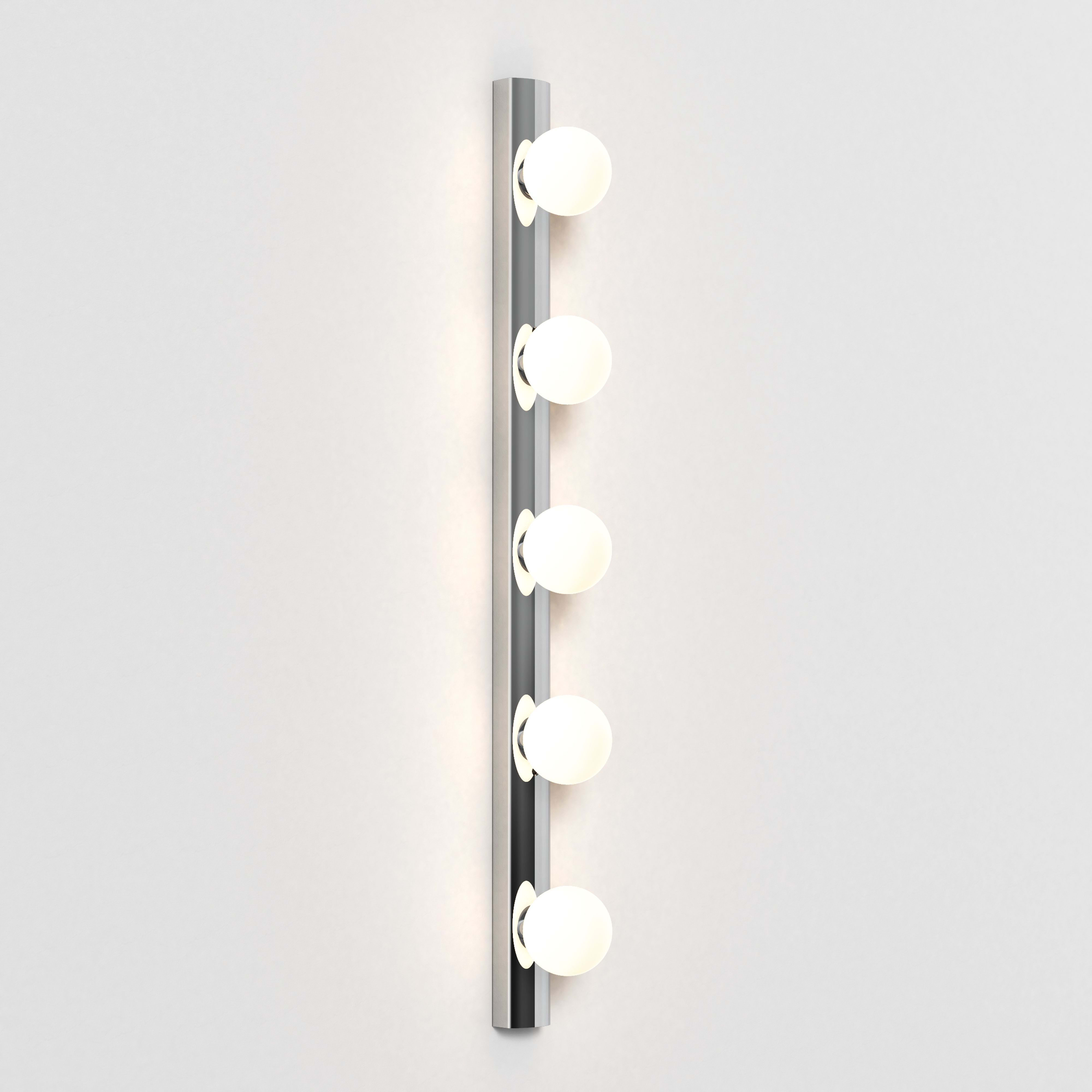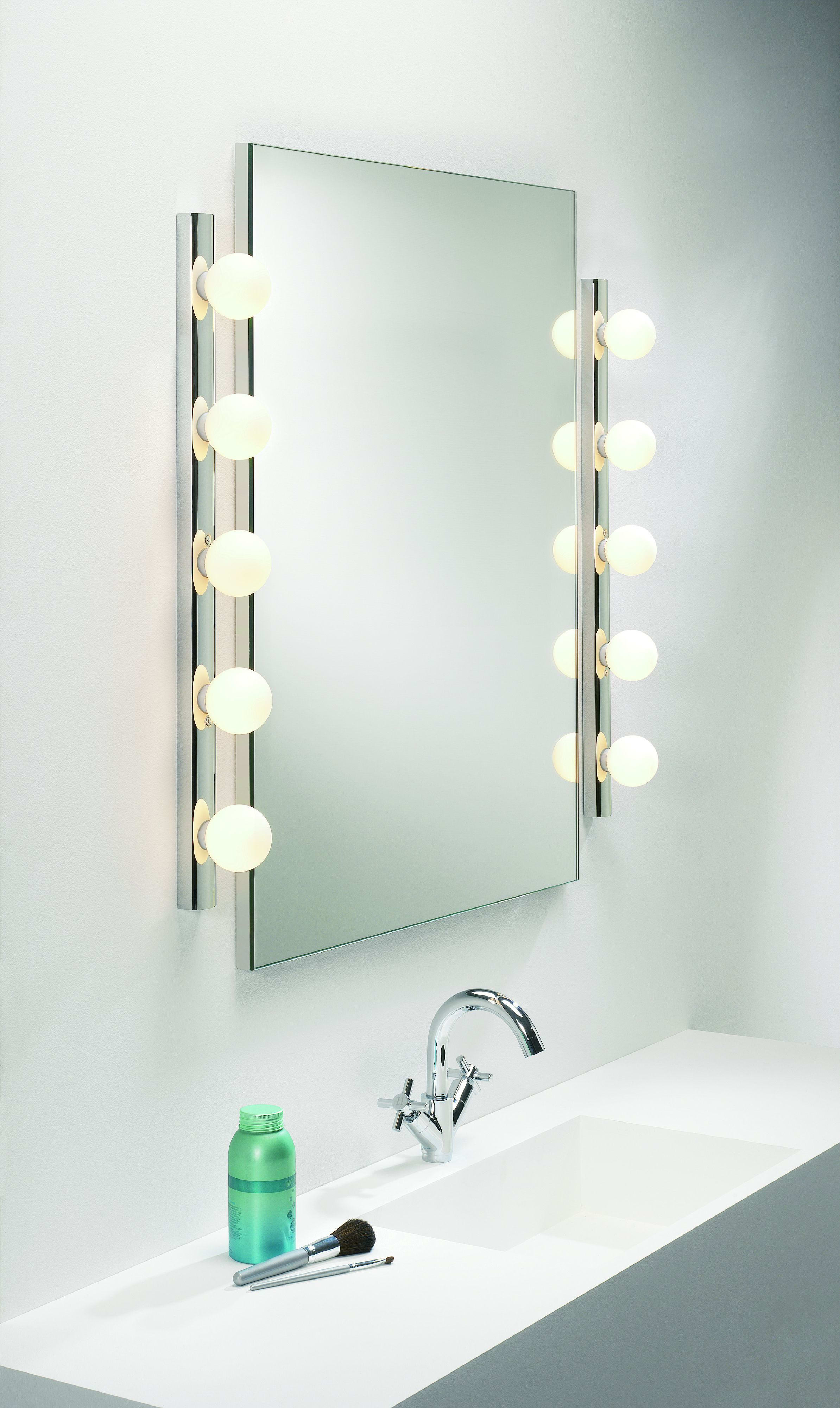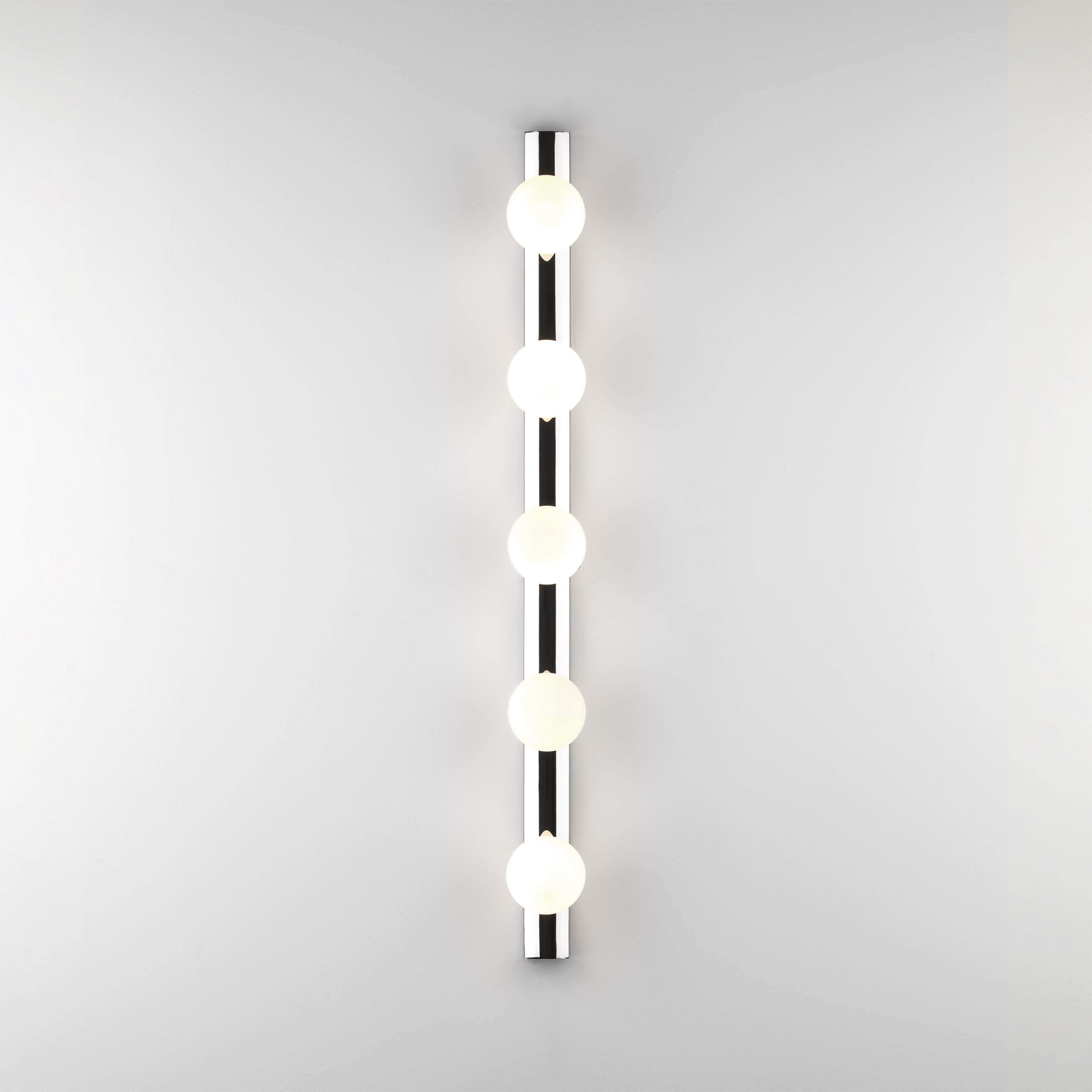 Interprétation contemporaine du miroir hollywoodien classique, cette applique est dotée d'un corps filiforme en chrome poli et de globes à LED en verre soufflé pour un éclairage vif et uniforme. Destinée aux salles d'eau ou dressings, elle peut être positionnée horizontalement comme verticalement autour d'un miroir. Elle est fournie non commutée pour fonctionner sans souci avec les systèmes d'éclairages intégrés.