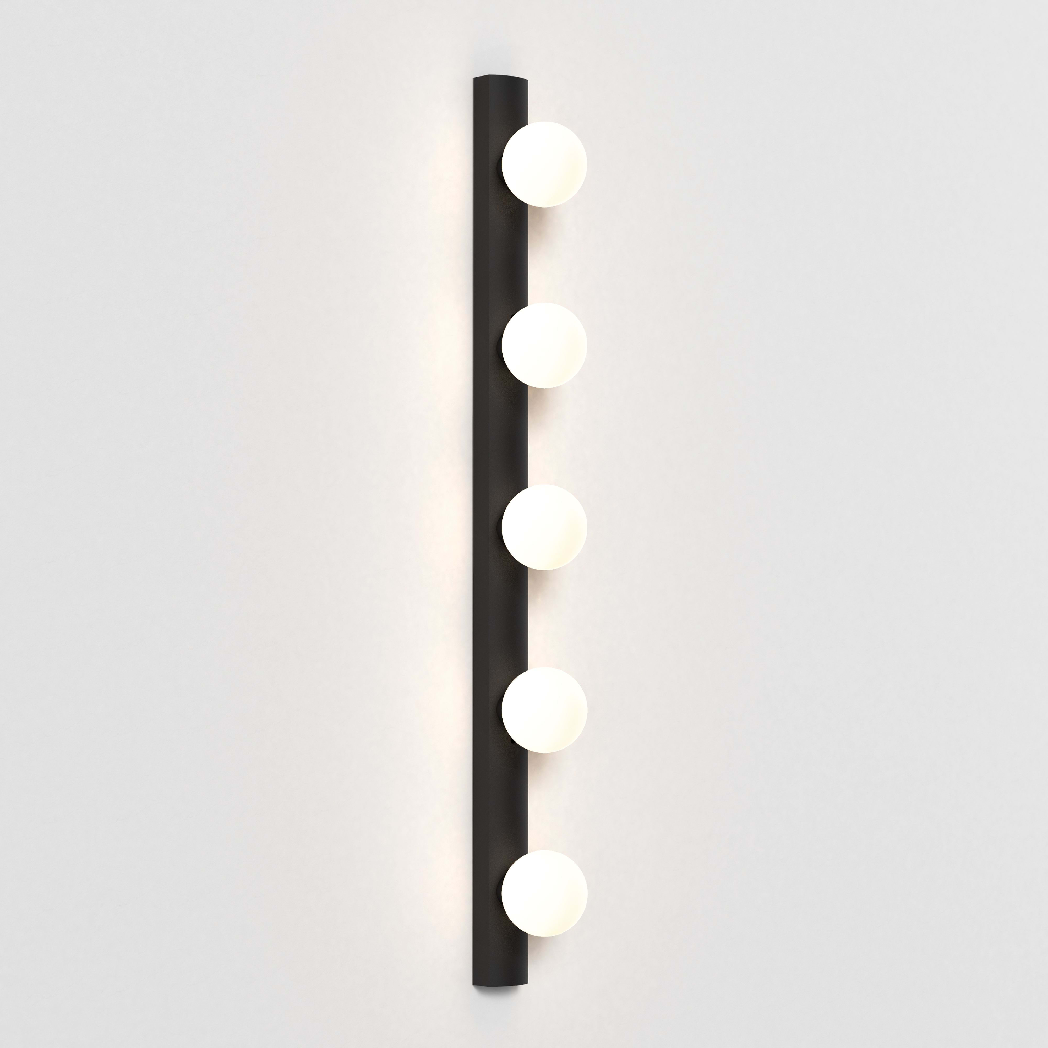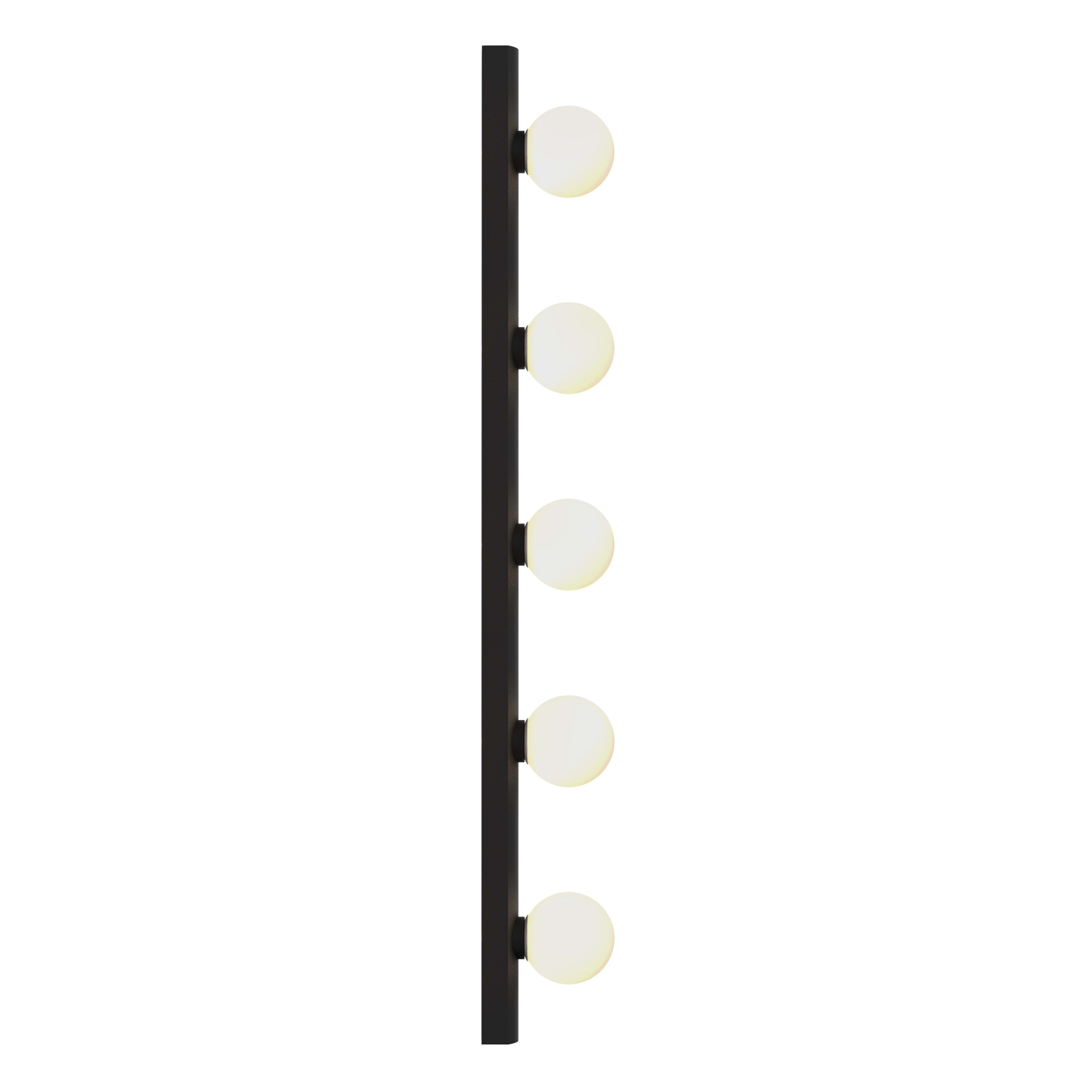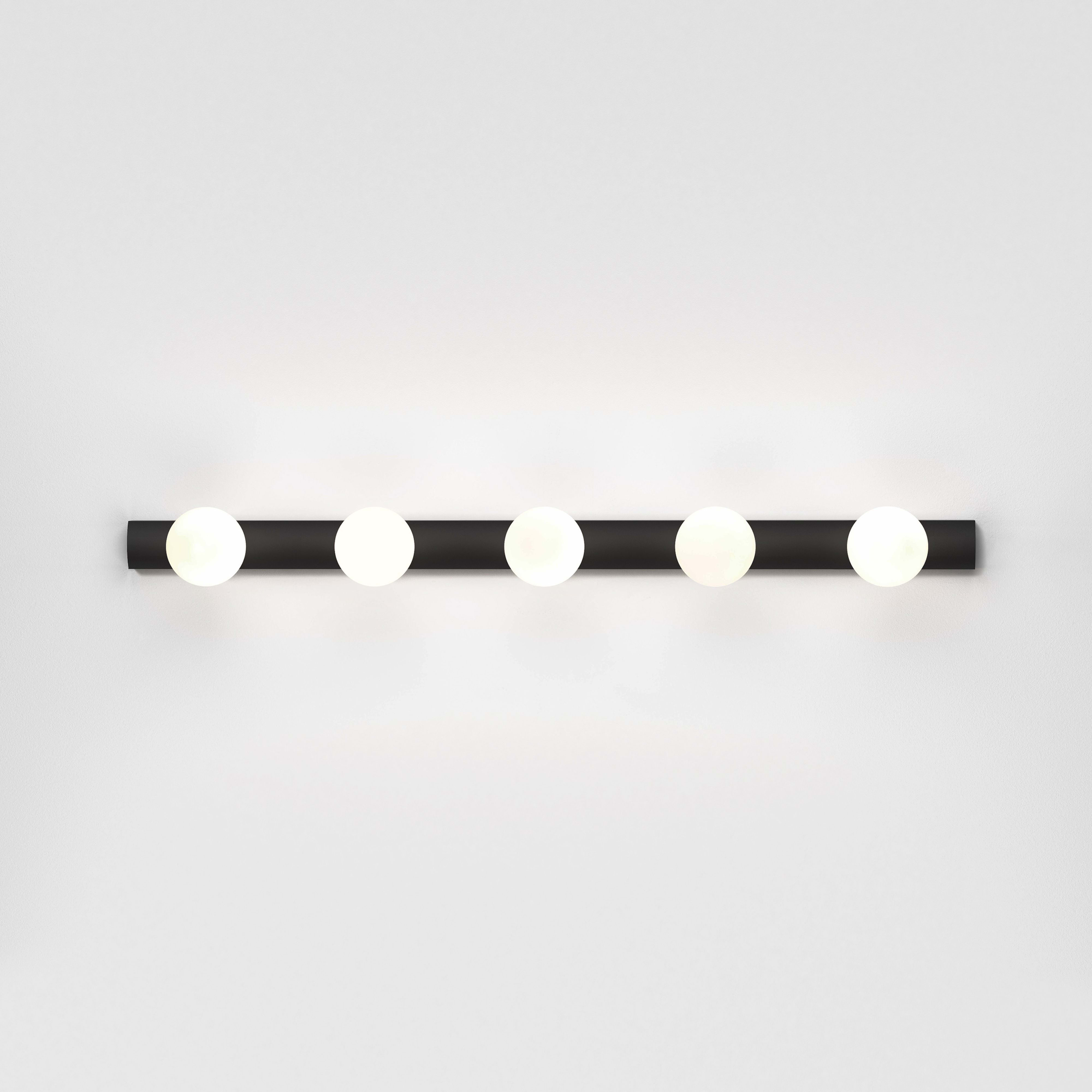 Interprétation contemporaine du miroir hollywoodien classique, cette applique est dotée d'un corps filiforme en acier noir mat et de 5 globes en verre soufflé pour un éclairage vif et uniforme. Destinée aux salles d'eau ou dressings, elle peut être positionnée horizontalement comme verticalement autour d'un miroir. Elle est fournie non commutée pour fonctionner sans souci avec les systèmes d'éclairages intégrés.