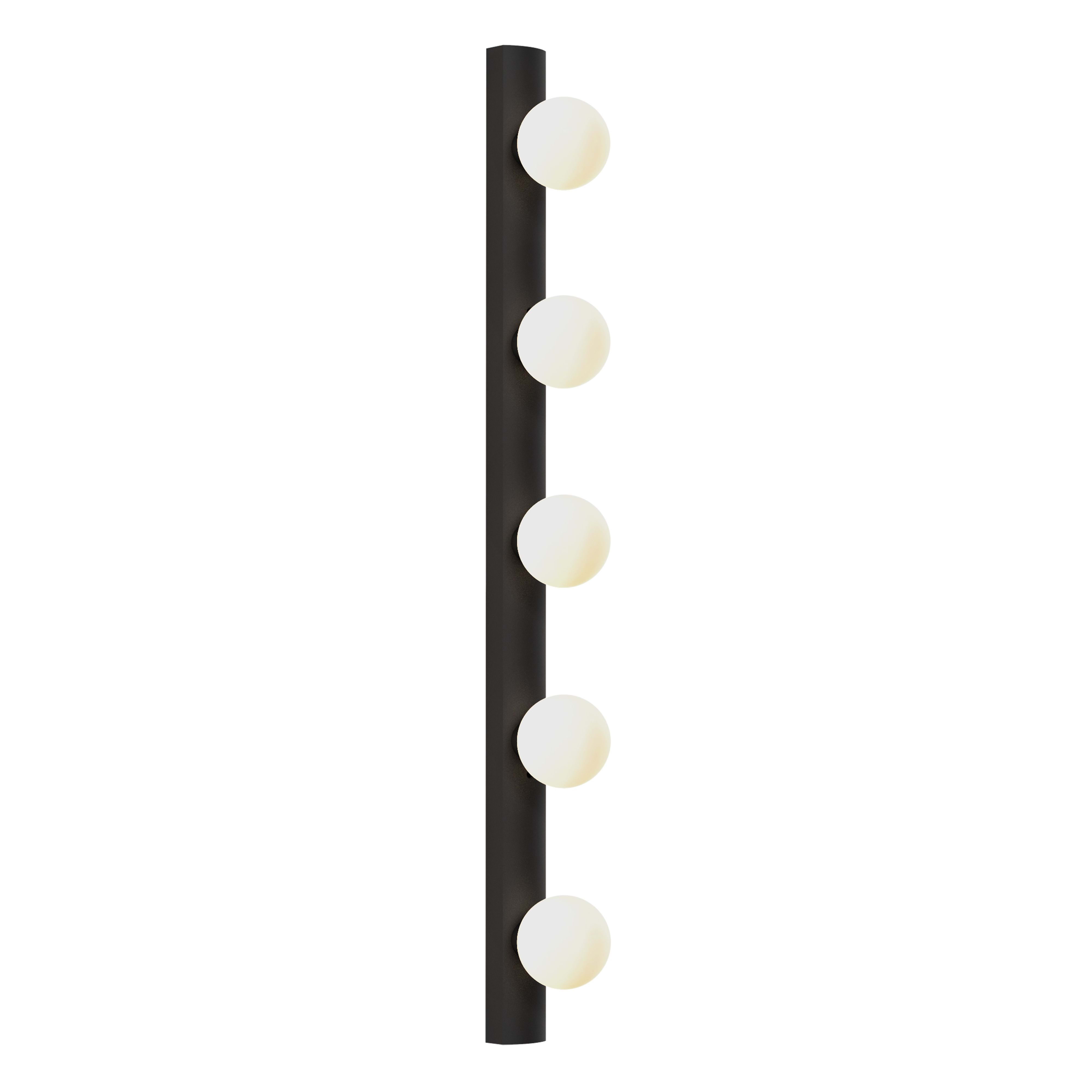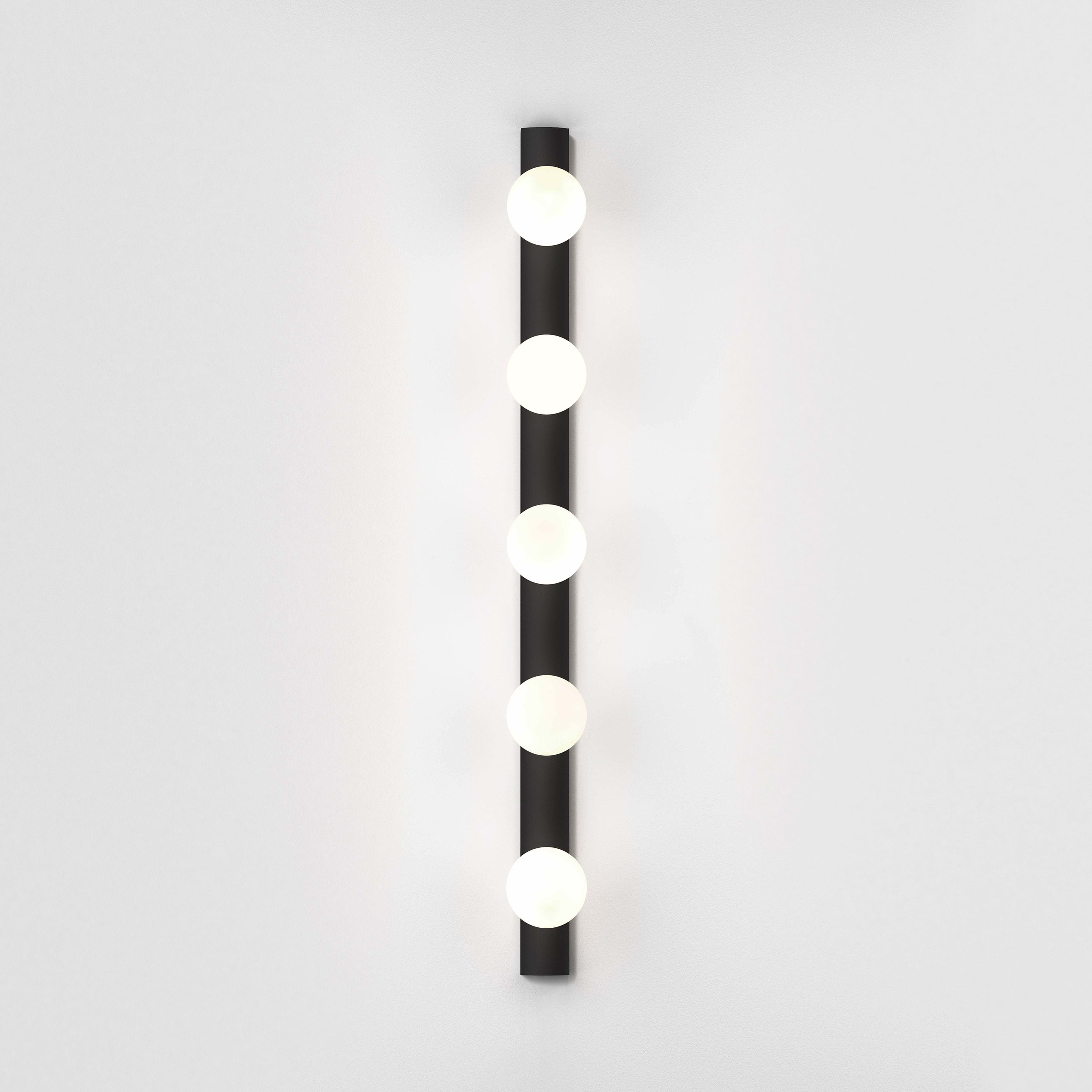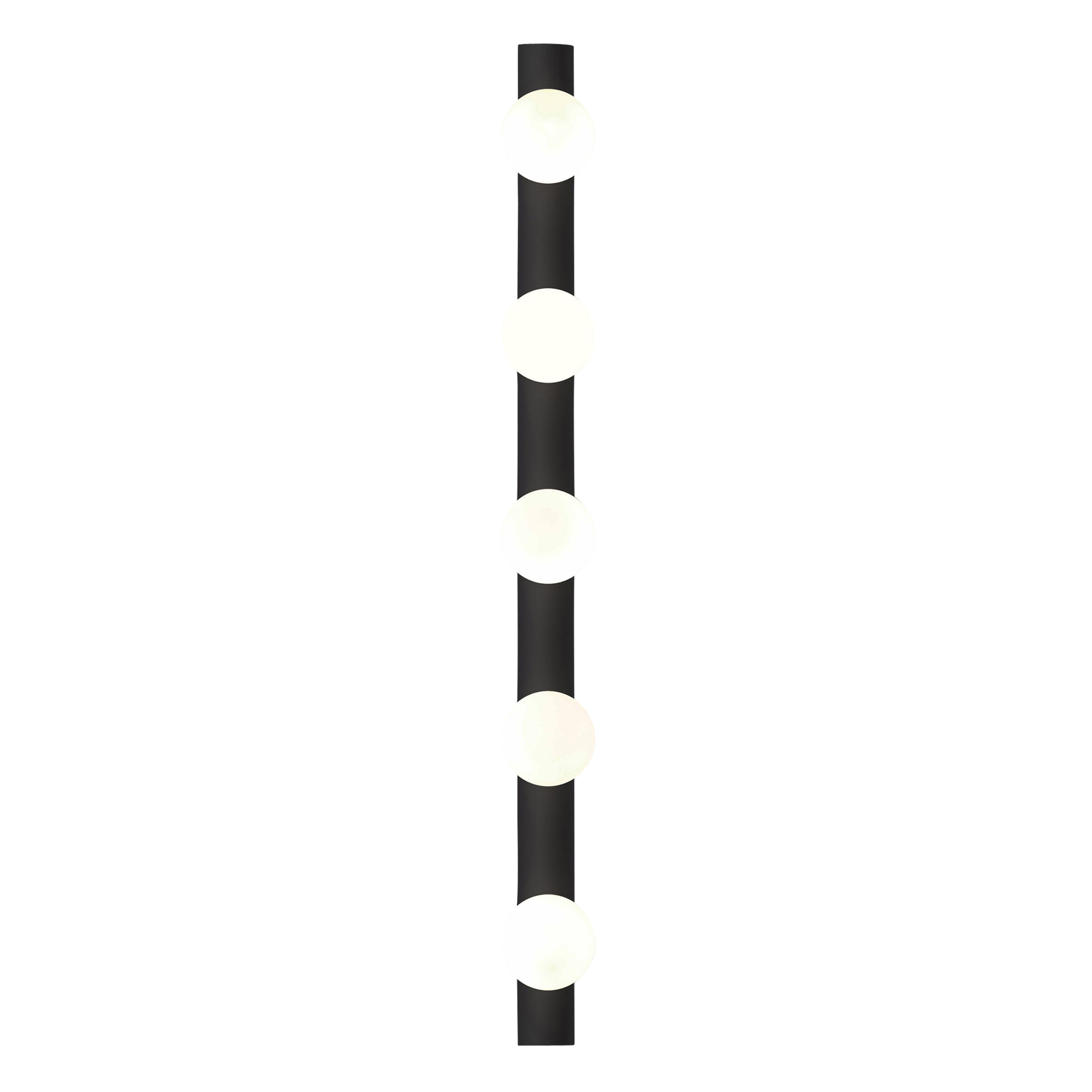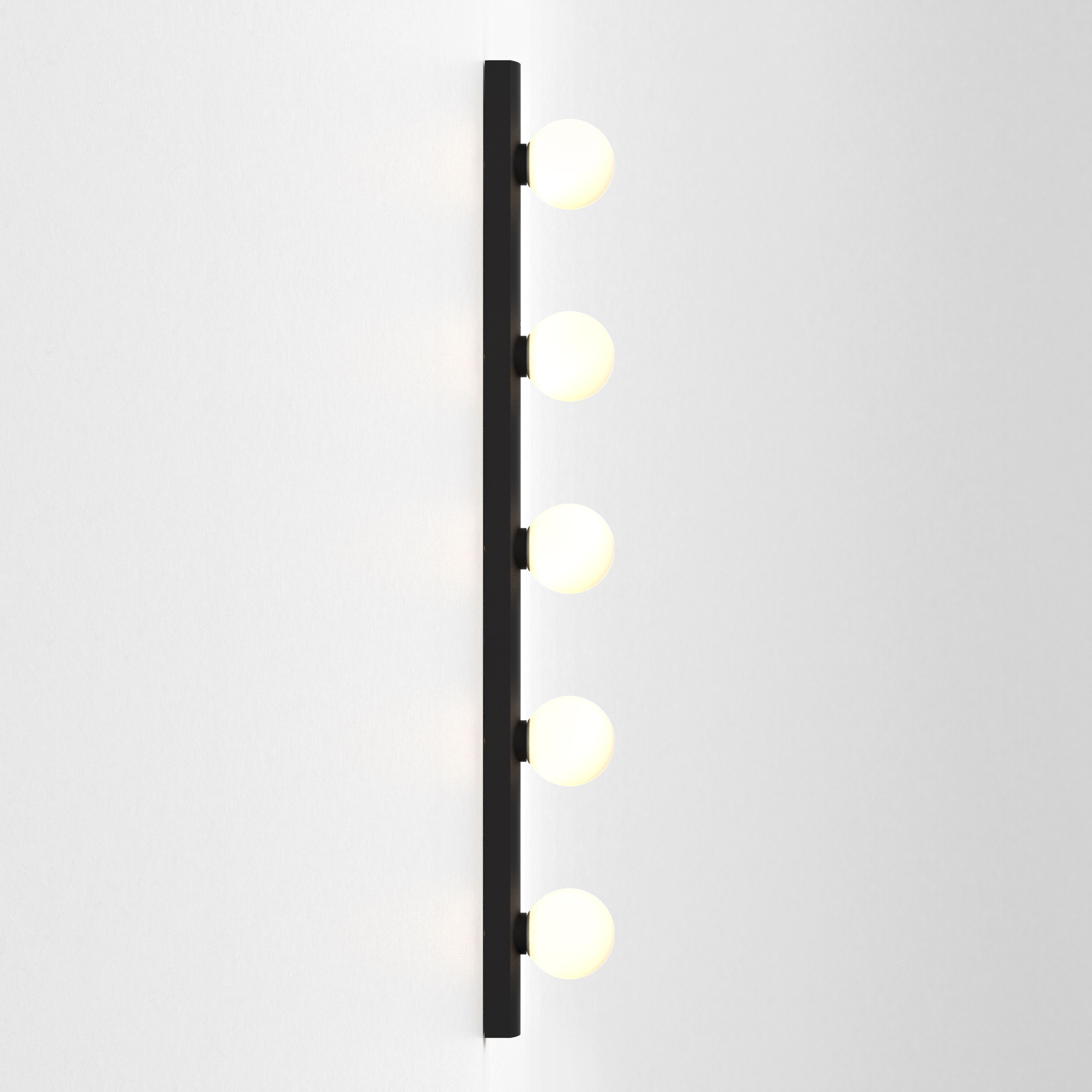 Interprétation contemporaine du miroir hollywoodien classique, cette applique est dotée d'un corps filiforme en acier noir mat et de 5 globes en verre soufflé pour un éclairage vif et uniforme. Destinée aux salles d'eau ou dressings, elle peut être positionnée horizontalement comme verticalement autour d'un miroir. Elle est fournie non commutée pour fonctionner sans souci avec les systèmes d'éclairages intégrés.