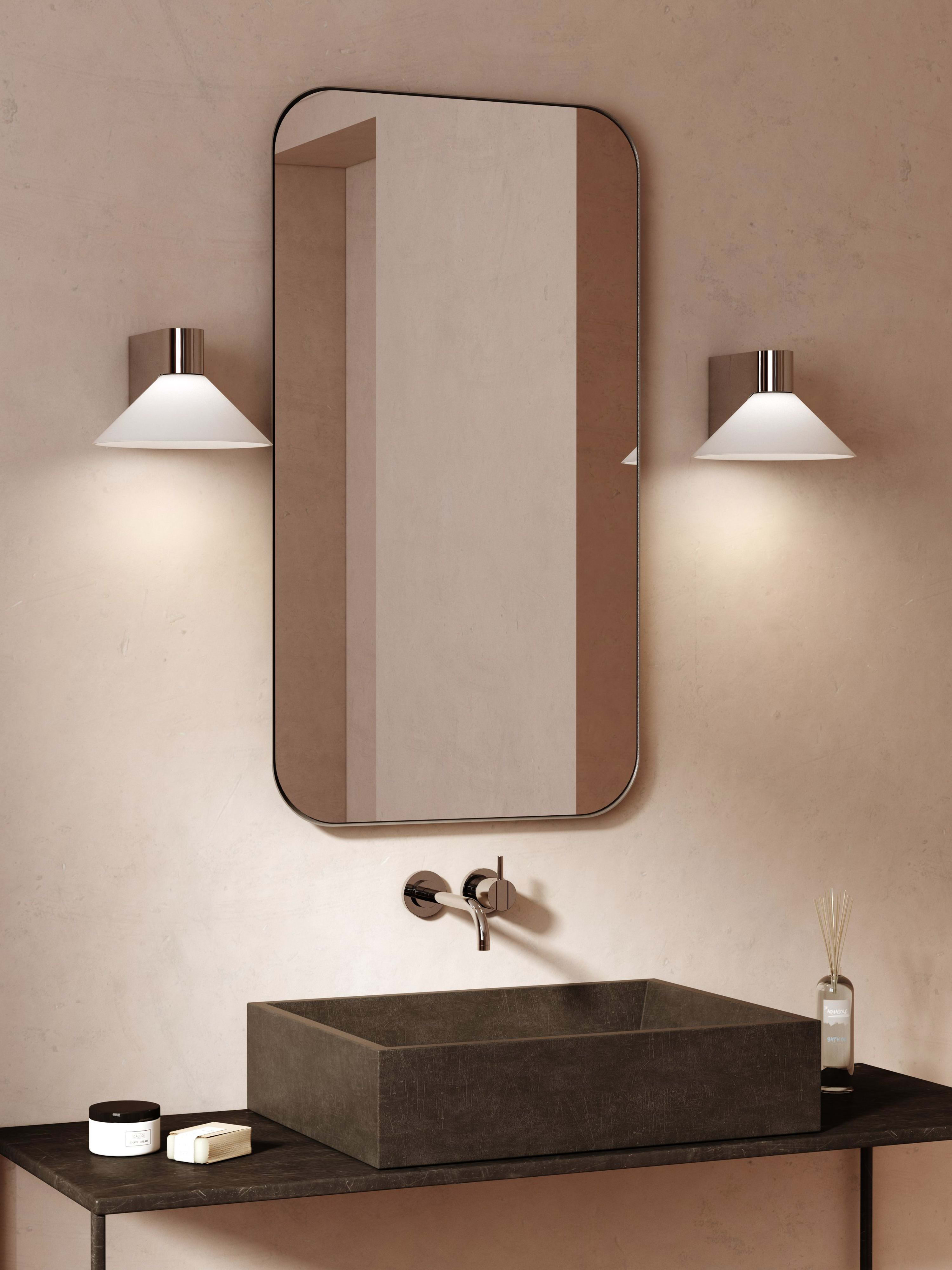 Sa base en métal nette, moulée sous pression, et son abat-jour conique en verre soufflé confèrent à cette applique murale pour salle d'eau, profilée et aux lignes géométriques, un charme atemporel. Le design du modèle Conic véhicule un sens apaisant de symétrie tout en offrant un éclairage d’ambiance. Sa pureté de forme est pensée pour être utilisée en duo, de chaque côté d’un miroir de salle d’eau.