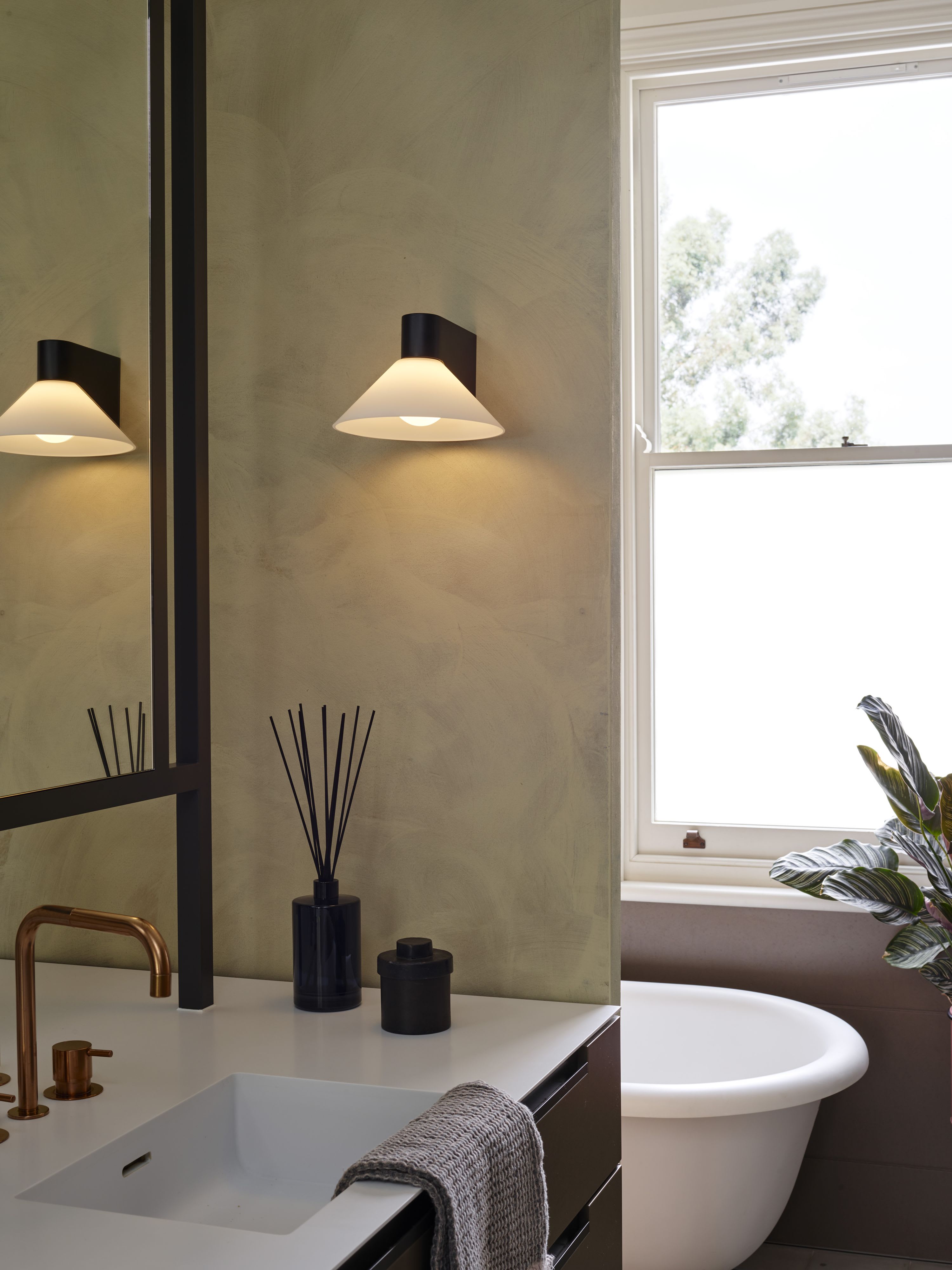 Sa base en métal nette, moulée sous pression, et son abat-jour conique en verre soufflé confèrent à cette applique murale pour salle d'eau, profilée et aux lignes géométriques, un charme atemporel. Le design du modèle Conic véhicule un sens apaisant de symétrie tout en offrant un éclairage d’ambiance. Sa pureté de forme est pensée pour être utilisée en duo, de chaque côté d’un miroir de salle d’eau.