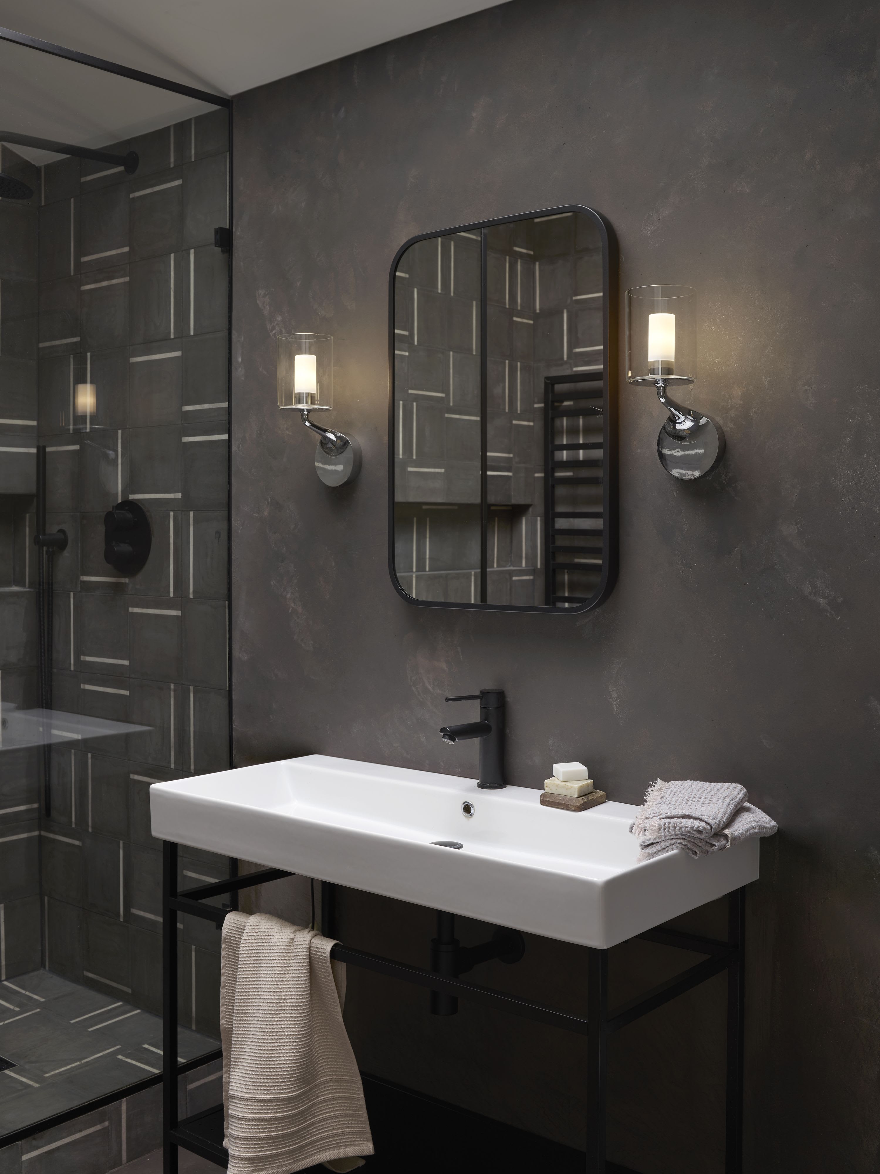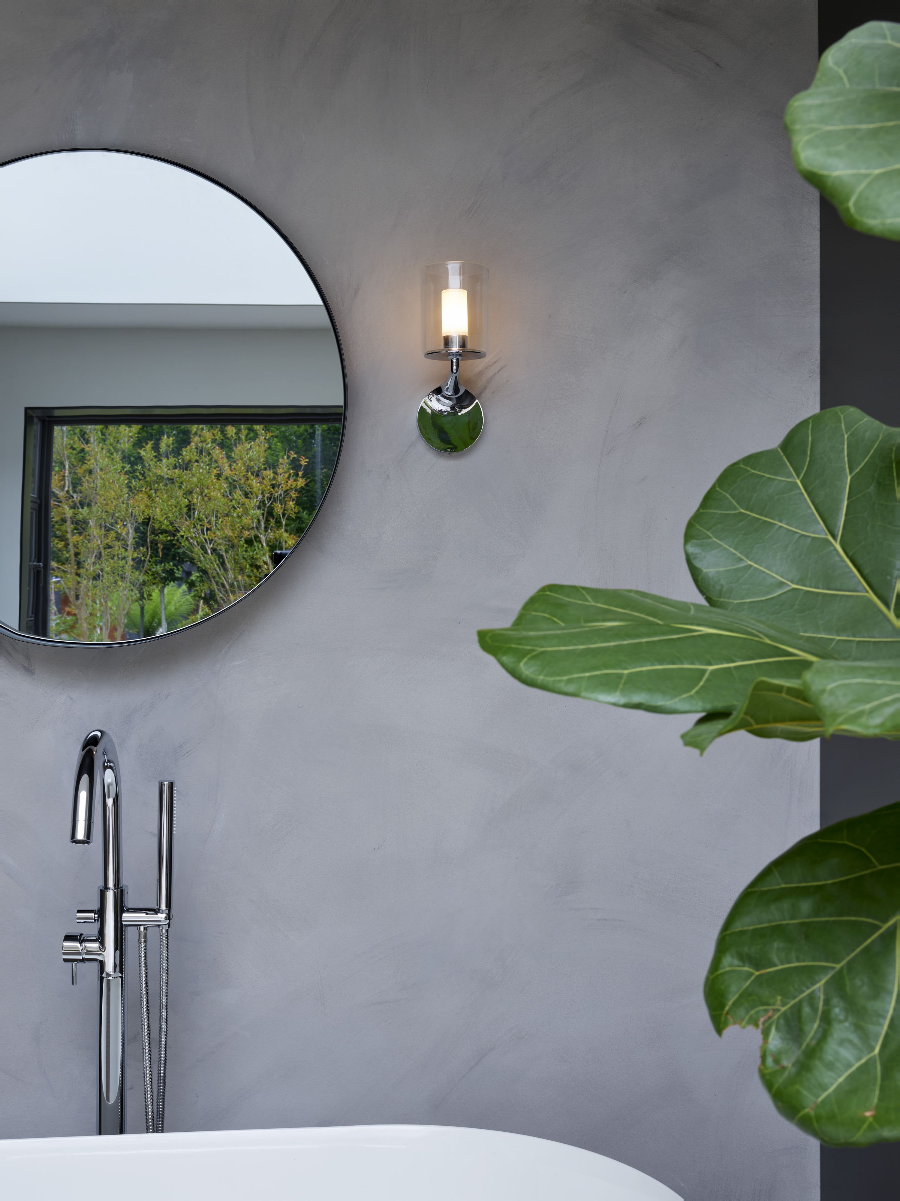 D'inspiration architecturale, l’applique murale pour salle d'eau Elena est éminemment polyvalente : elle trouve facilement sa place dans les espaces contemporains comme traditionnels. Elle se démarque par son bras en forme de gouttelette de métal liquide gelé en suspension et son design racé qui se fond aisément dans toutes les ambiances de salle d’eau. Associé à un diffuseur en verre opale et à un séduisant abat-jour circulaire en verre, elle offre un éclairage efficace, sans ombre, idéal pour le rasage ou le maquillage.
