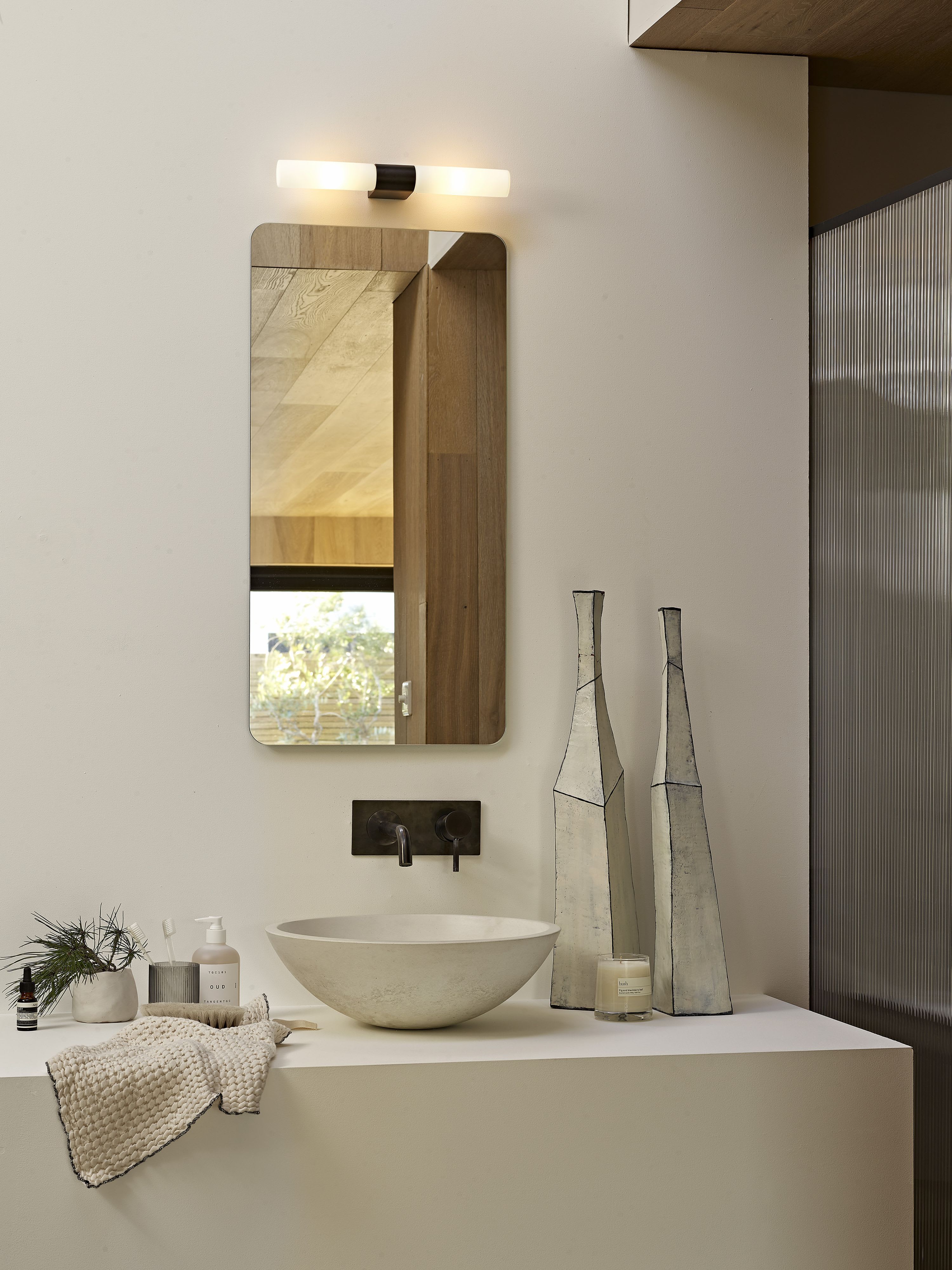 Montée au-dessus d’un miroir, cette applique murale, aux proportions parfaites, apporte une symétrie élégante à toutes les salles d’eau. Elle émet un éclairage vif et uniforme, ce qui en fait un modèle efficace pour l’éclairage fonctionnel, tandis que la finition en verre dépoli évite l’éblouissement. Son design se démarque par ses lignes profilées.