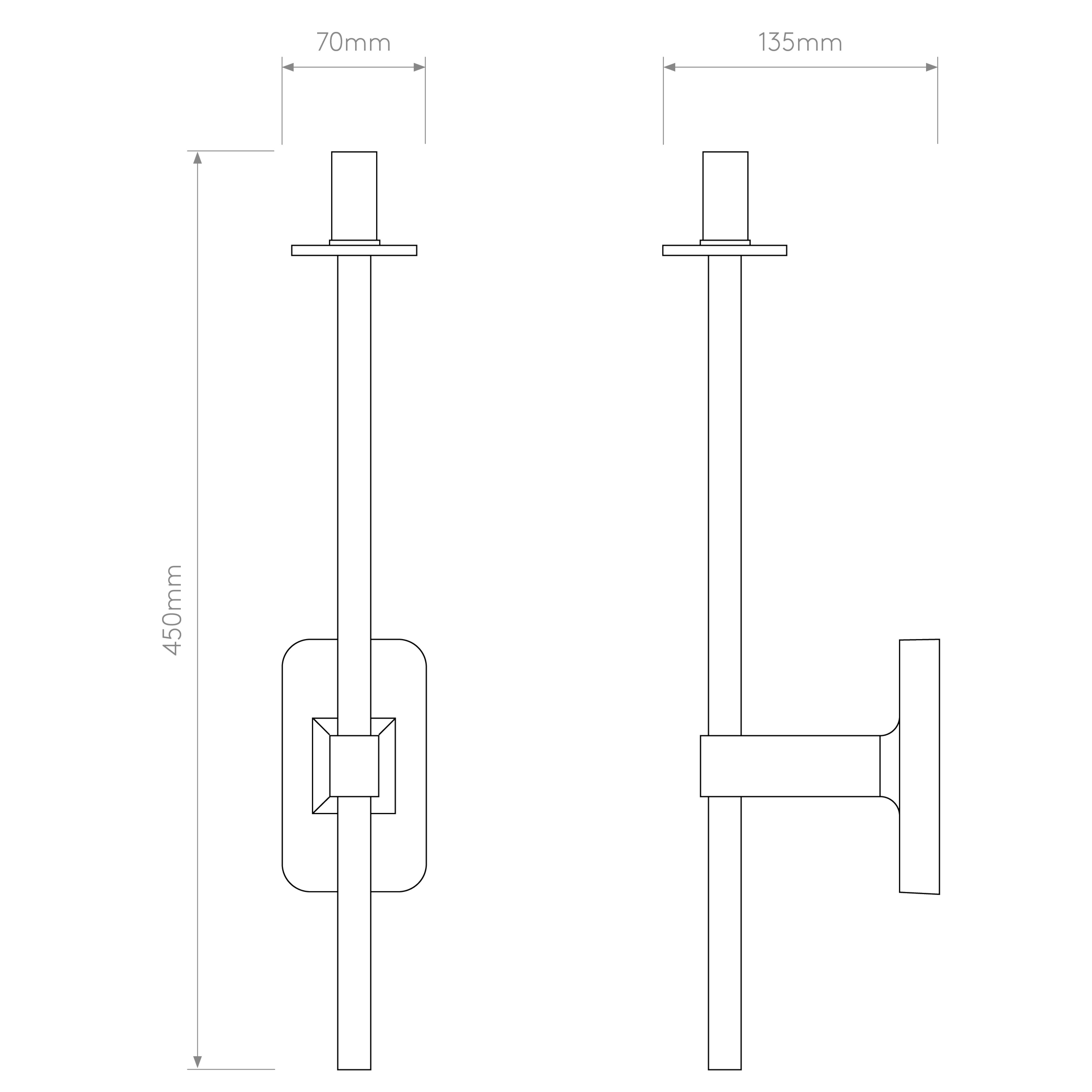 Applique murale d'intérieur.Fini laiton ancien.Fonctionne avec 1 LED de 3 W (maxi.) G9.Indice de protection IP 44, peut être utilisé dans les salles d'eau, zones 2 et 3.Classe I, relié à la terre.Dimensions : H 450 l 70 P 135 mm