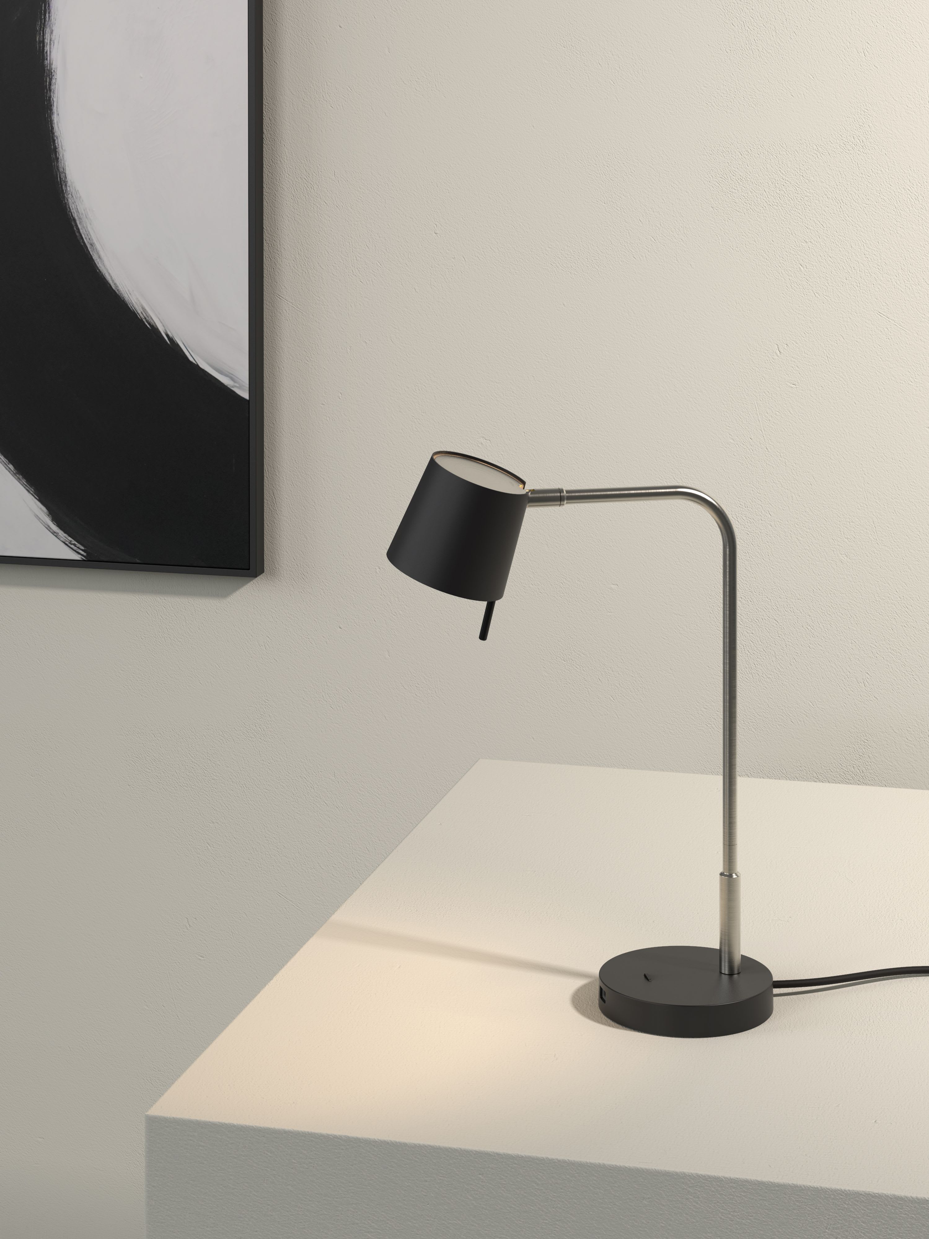 Miura Desk USB est une lampe de bureau à LED atemporelle, éminemment fonctionnelle et compacte. Principalement destinée aux chambres d'hôtel, la simplicité de Miura, ainsi que sa polyvalence en font également le luminaire idéal pour les environnements domestiques. Elle se compose d'un diffuseur moulé sur mesure pour un éblouissement réduit et d'une articulation robuste pour un réglage facile. L'abat-jour et le corps, parfaitement proportionnés, peuvent être personnalisés dans des combinaisons de nickel mat, or mat et noir mat, chacune ancrée sur une base noir mat dotée d'un interrupteur intégré et d'un port USB.