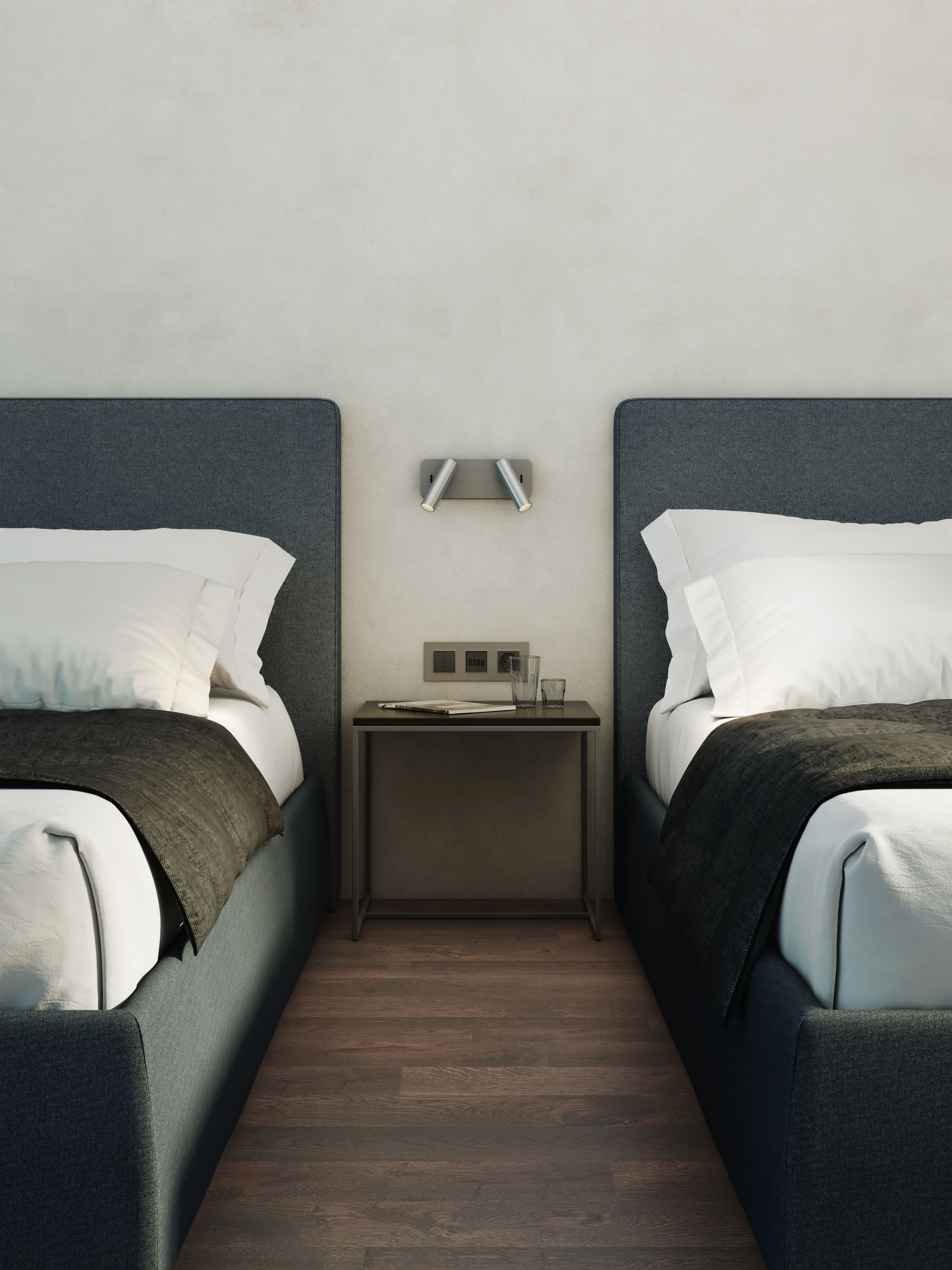 Forte de ses lignes épurées et nettes, l’intelligence de cette liseuse montée au mur n’a d’égal que son style. Pensée pour être montée au-dessus d'un lit double ou entre 2 lits jumeaux, ce modèle est doté de 2 têtes à commande individuelle. La lumière, peu éblouissante, peut ainsi être orientée précisément sans perturber le sommeil des autres. Elle est proposée dans plusieurs finitions pour s’adapter à toutes les décorations.