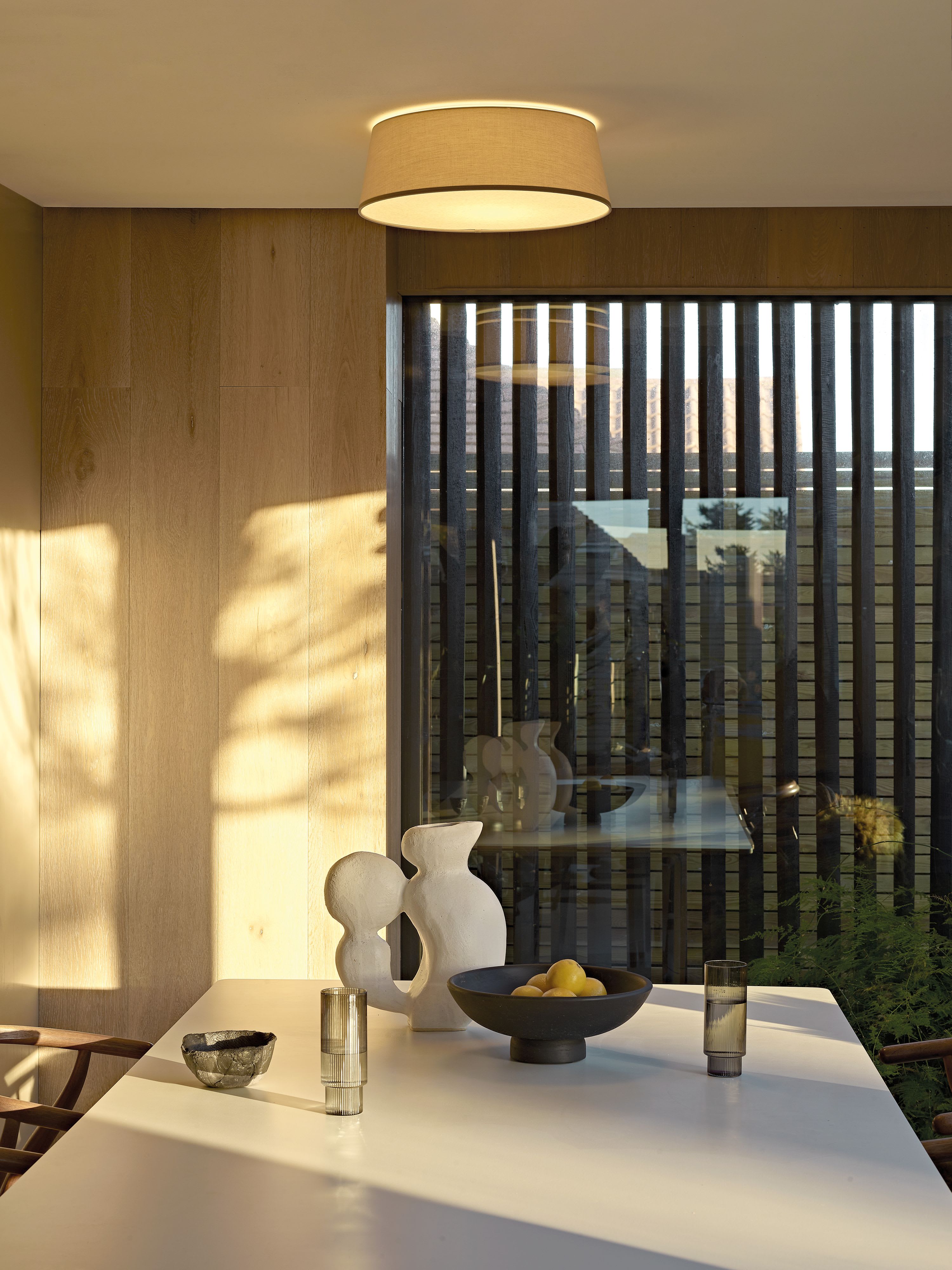 Simple et subtilement fuselé, ce plafonnier trouve aisément sa place dans tous les intérieurs. Il est disponible dans 3 formats : le plus grand modèle est idéal pour les séjours et les chambres, tandis que le plus petit convient aux couloirs. Le diffuseur en chamoisine et l’abat-jour en polycoton blanc ou mastic créent une douce lumière d’ambiance. Ils sont fixés à un plateau plafonnier en acier par des aimants, pour être aisément retirés pour être nettoyés.