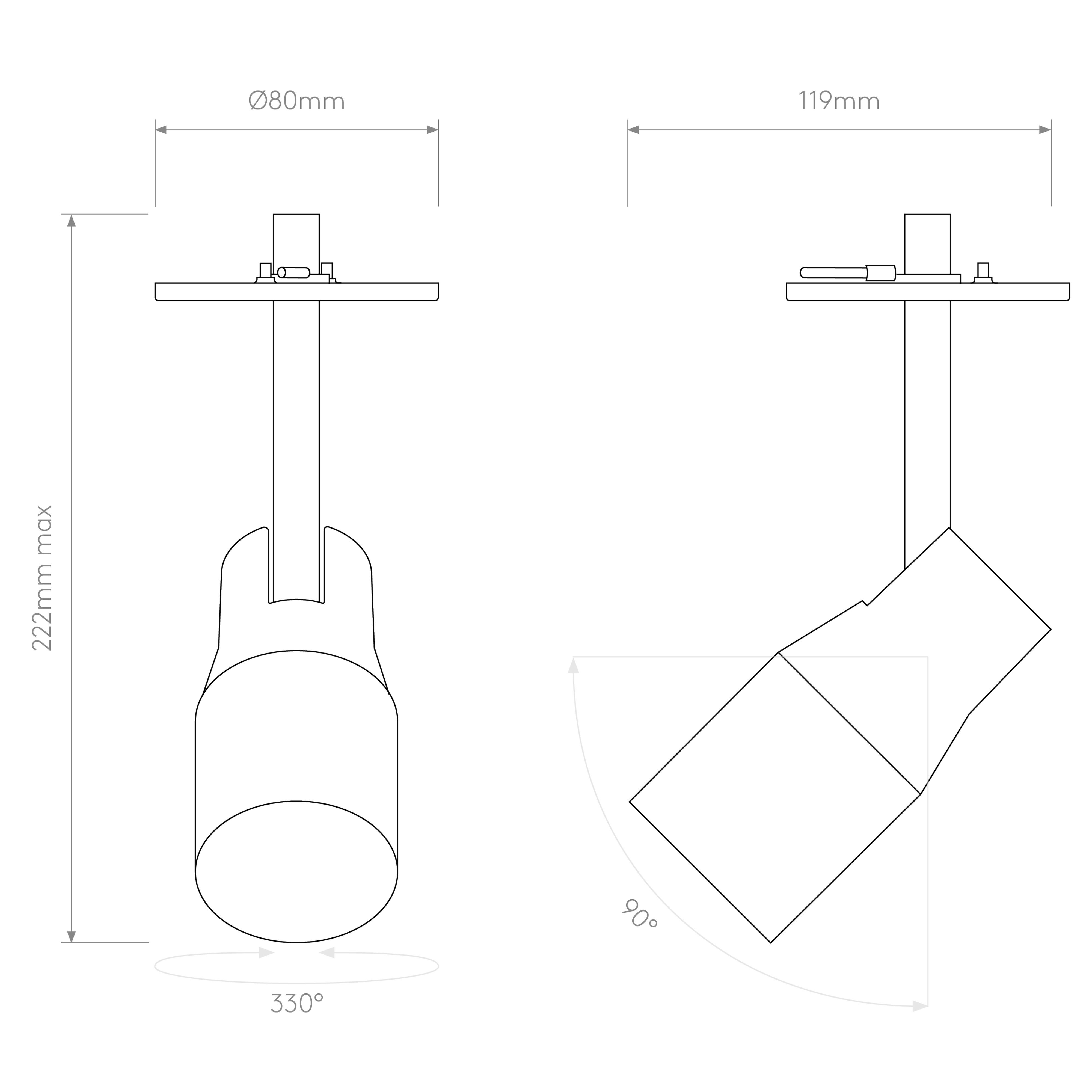 Spot intérieur.Fini noir mat.Fonctionne avec 1 LED de 6 W (maxi.) GU10.Indice de protection IP 20, peut être utilisé dans les salles d'eau, zone 3.Classe I, relié à la terre.Dimensions : H 202 (maxi.) P 30 Dia 80 mm