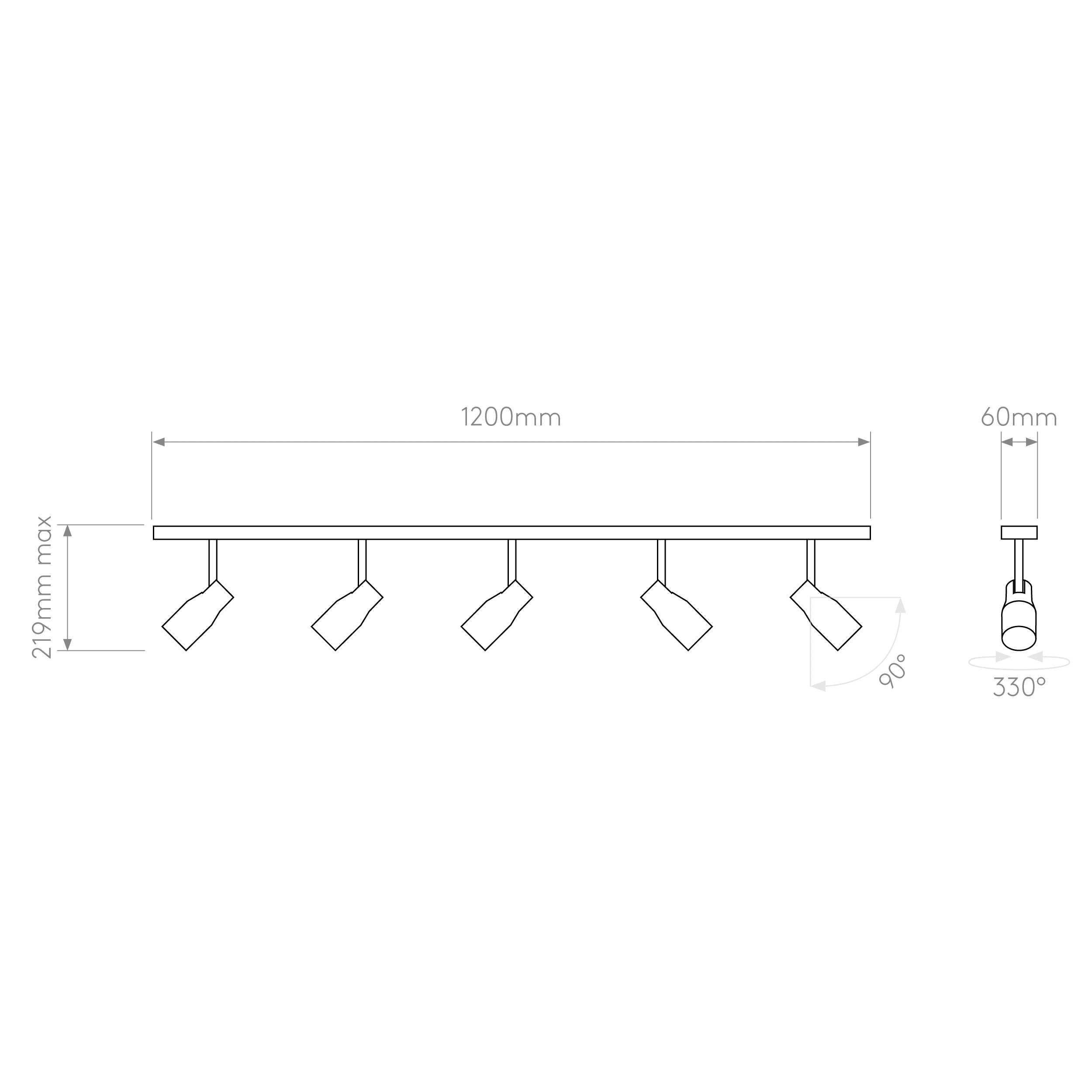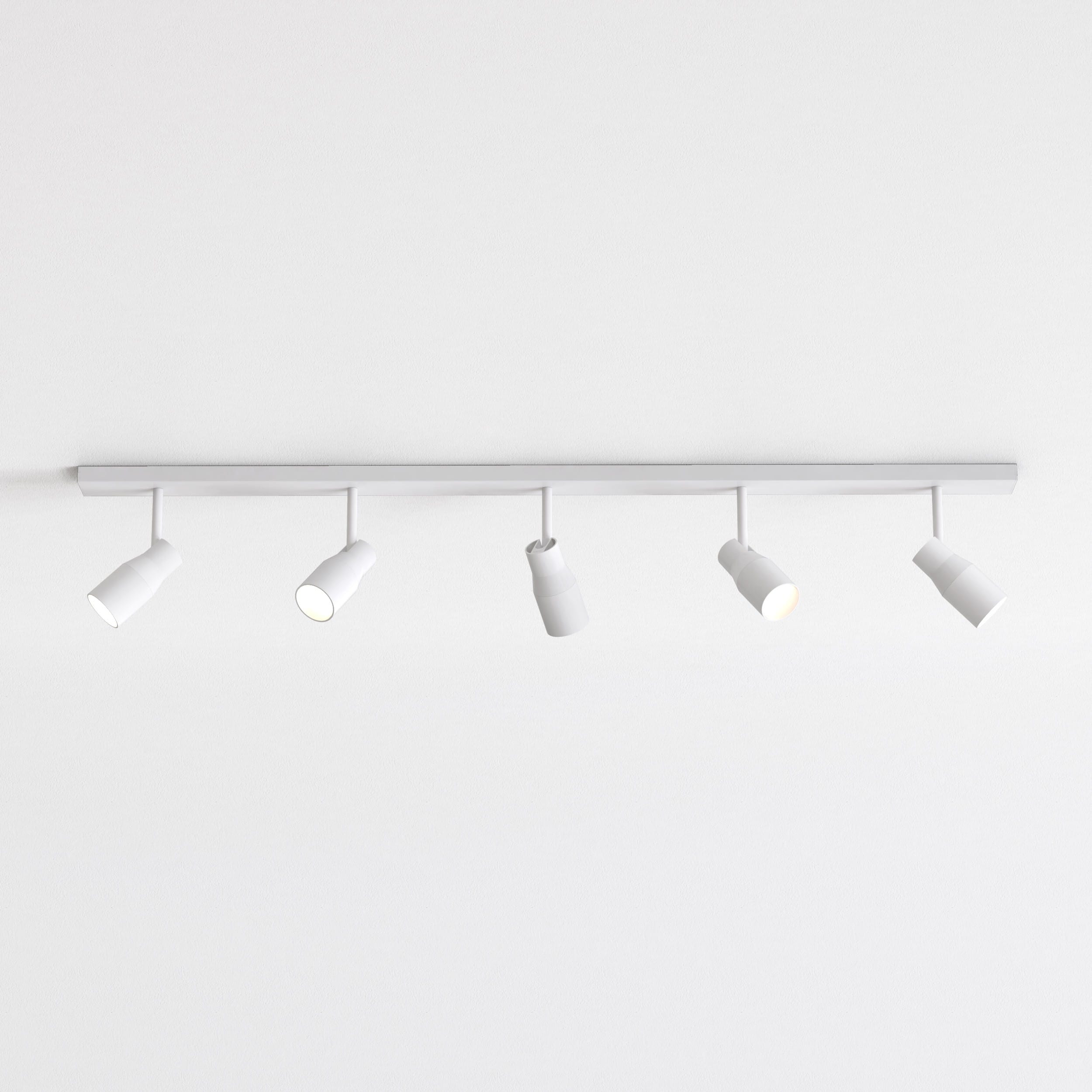 Spot intérieur.Fini blanc texturé.Fonctionne avec 5 LED de 6 W (maxi.) GU10.Indice de protection IP 20, peut être utilisé dans les salles d'eau, zone 3.Classe I, relié à la terre.Dimensions : H 219 l 1200 P 60 mm
