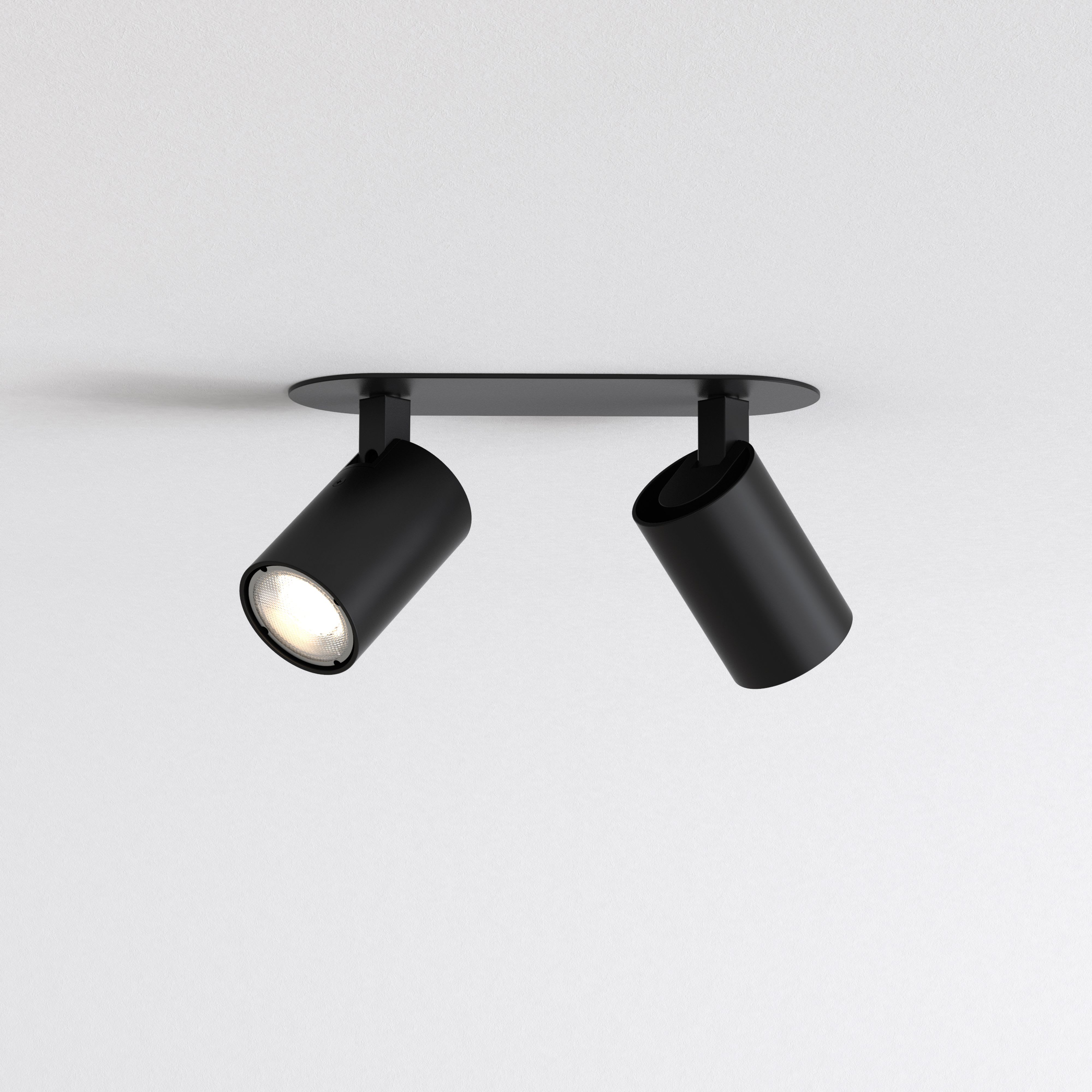 Spot intérieur.Fini noir mat.Fonctionne avec 2 LED de 6 W (maxi.) GU10.Indice de protection IP 20, peut être utilisé dans les salles d'eau, zone 3.Classe I, relié à la terre.Dimensions : H 120 l 295 P 21 Dia 80 mm