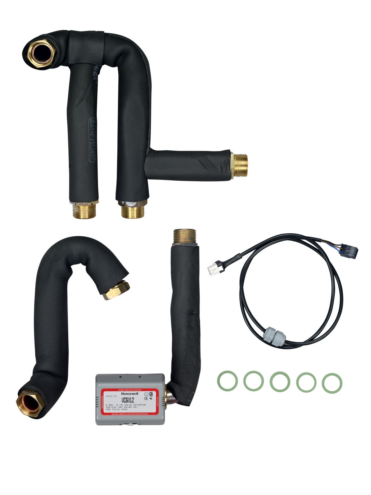 Montage en relève de chaudière pour les PAC Duo, composé d'une vanne directionnelle motorisée, de tuyauteries, de flexibles isolés, d'une sonde de départ, d'un connecteur