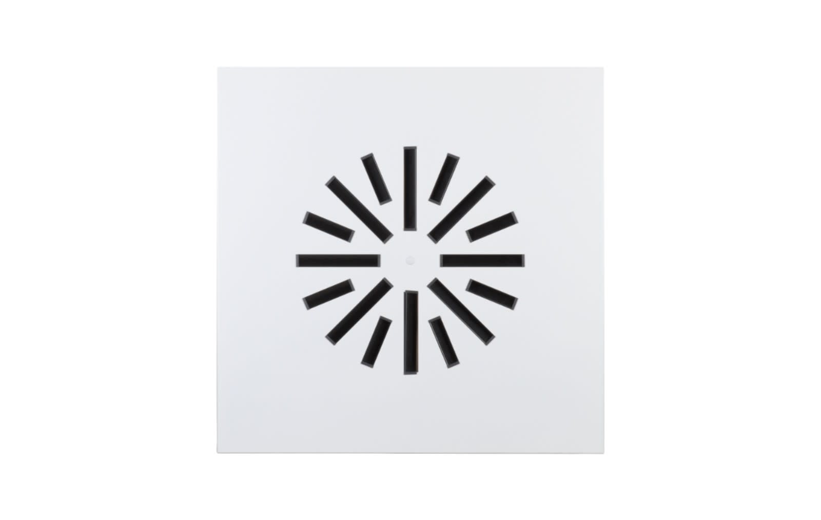 Diffuseur fabriqué en acier galvanisé et ailettes de déflexion sectorisées en aluminium noir ou blanc.