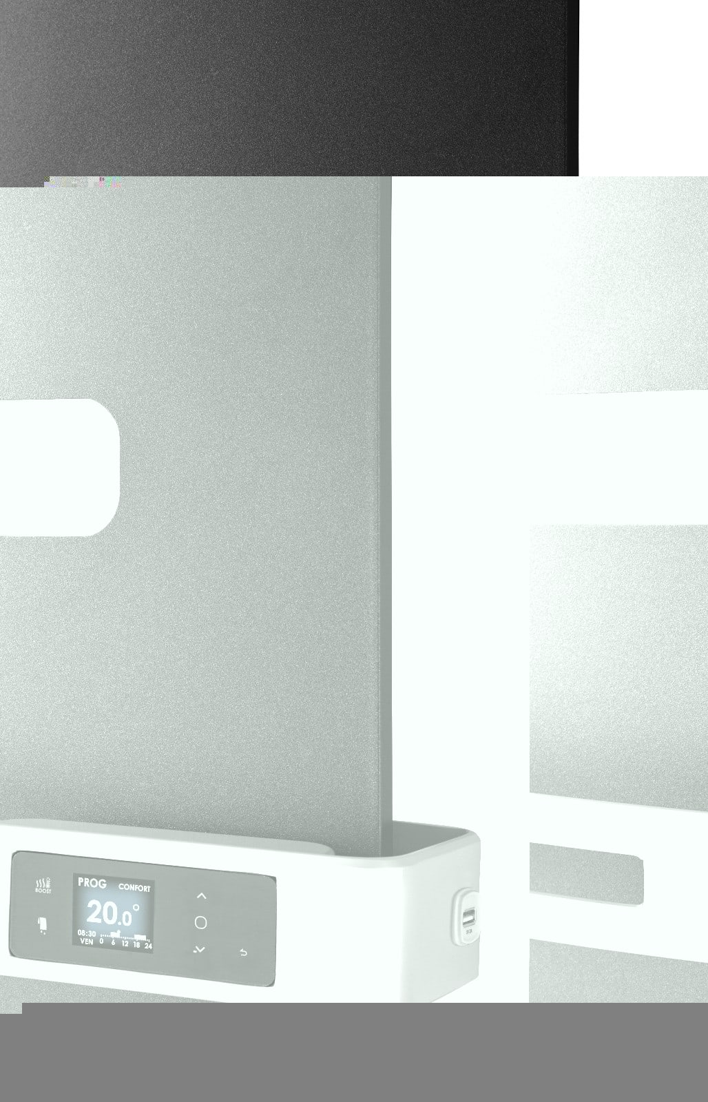 Boîtier de commande digital, affichage de l’heure et de la météo (bridge Cozytouch nécessaire).