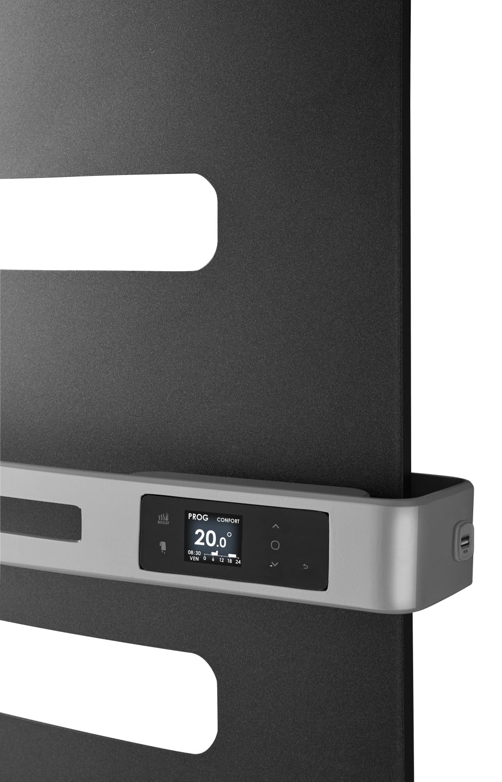 Boîtier de commande digital, affichage de l’heure et de la météo (bridge Cozytouch nécessaire).