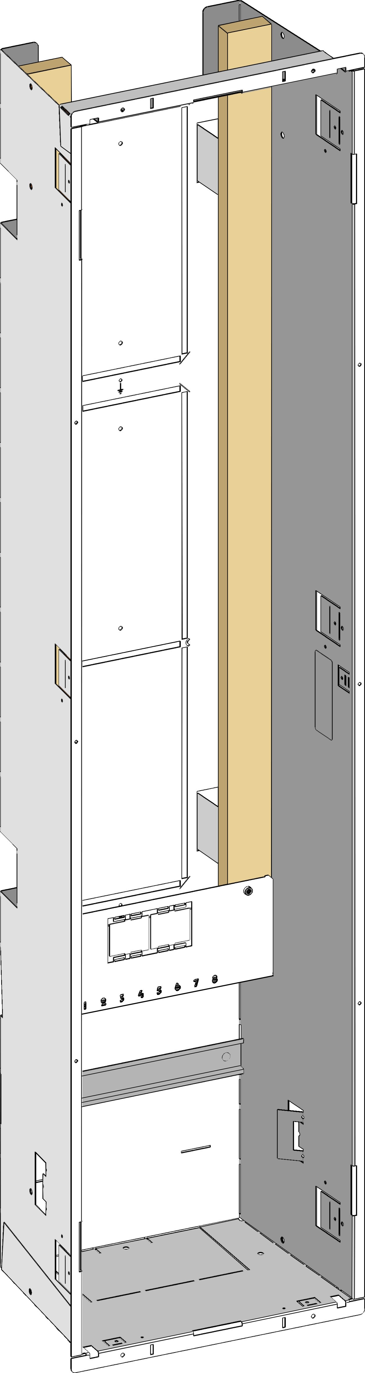 Bac volume attenant avec support de prises de courant et support de communication intégré. Une solution économique tout en 1, intégrant dans le volume attenant : un support de prises de courant complété par un bandeau accueillant jusqu'à 8 ainsi qu’un rail din accueillant les équipements du coffret de communication.
