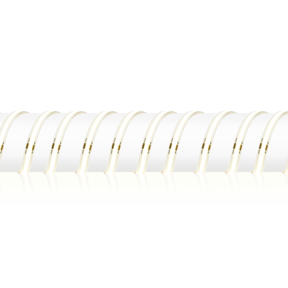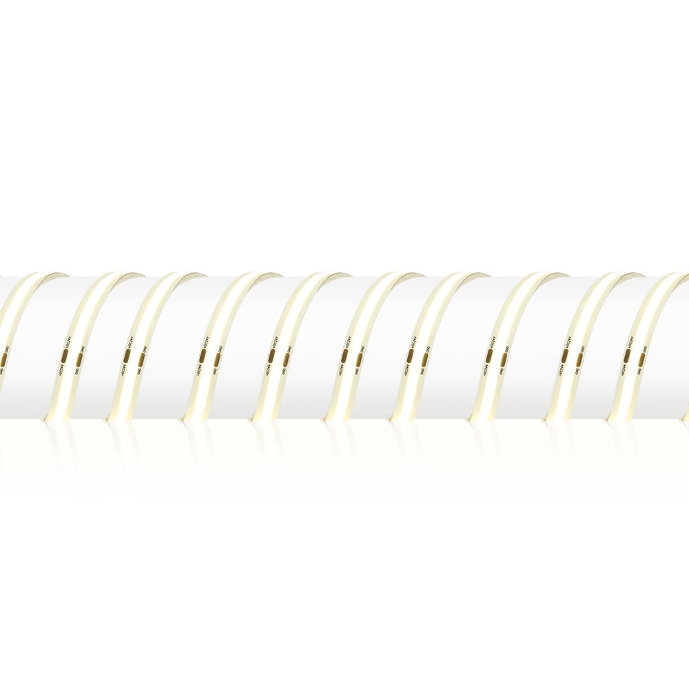Ruban LED COB monochrome avec adhésif 3M™ Permet une diffusion continue et homogène du flux lumineux sur la longueur du ruban Points de coupe tous les 50mm pour une plus grande flexibilité d'installation Angle de faisceau de 150° et 480 LED par mètre Les sections de longueurs supérieures à 5 mètres nécéssitent un raccordement en parallèle de l'alimentation électrique Longueur bobine 20m Garantie 3 ans