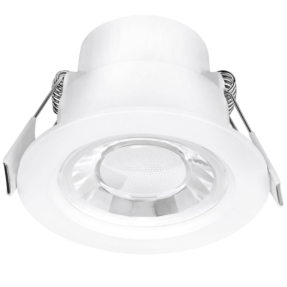 Spot encastré LED thermoplastique faible consommation pour bâtiment neuf ou rénovation Lentille polycarbonate multifacette EnFiniti pour un faible éblouissement et une apparence halogène Driver compact intégré pour une installation facile dans les plafonds étroits Version fixe IP44 - Etanche à l'air Protection contre les surtensions de 1,5 kV Garantie 3 ans