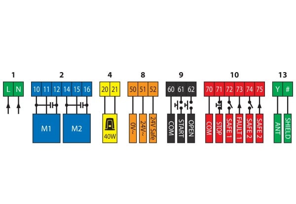 Armoire de commande à interrupteur de programmation (dip switch) pour un ou deux moteurs 230V/300W pour la motorisation de portail battants. Bornier standard.