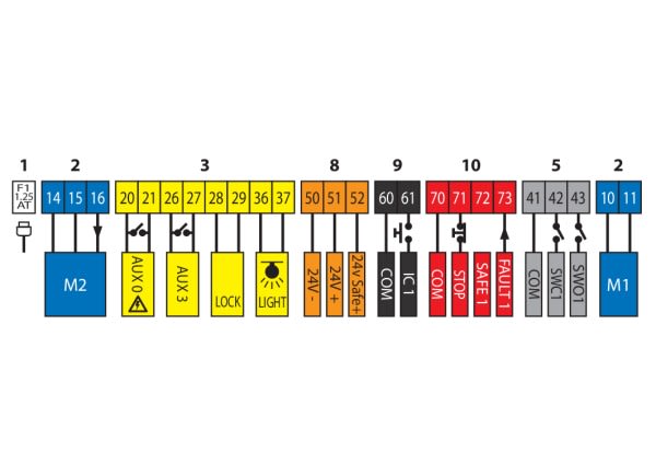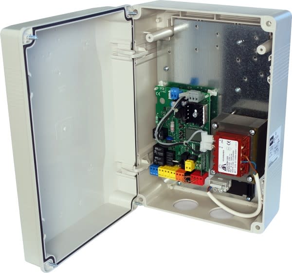 Armoire de commande pour 1 ou 2 opérateurs pour portes de garage basculantes Alimentation carte : 230V monophasé.Refermeture automatique, fermeture rapide, blocage des impulsions, maintien du blocage Compatibilité : HYDRA, HYDRA R